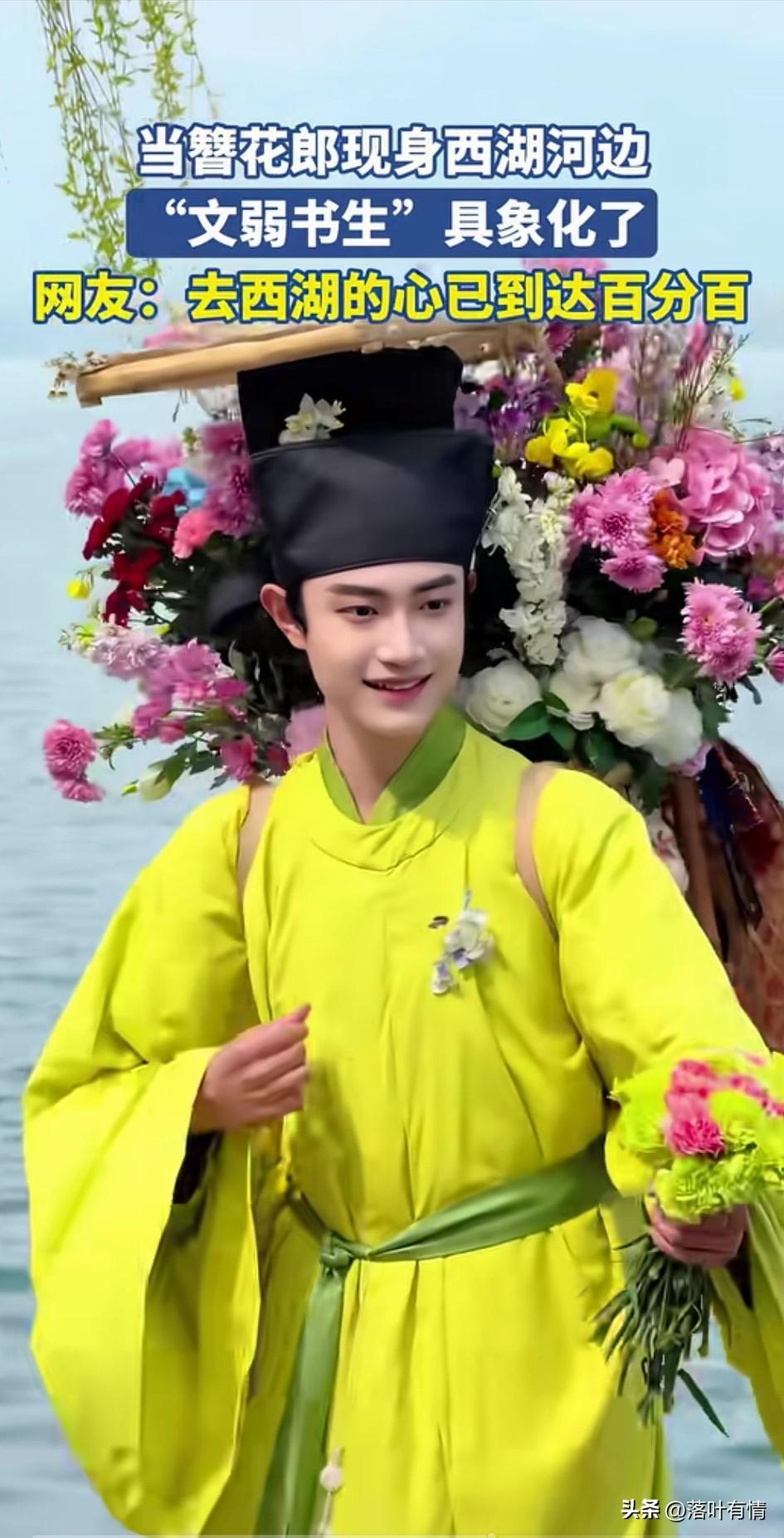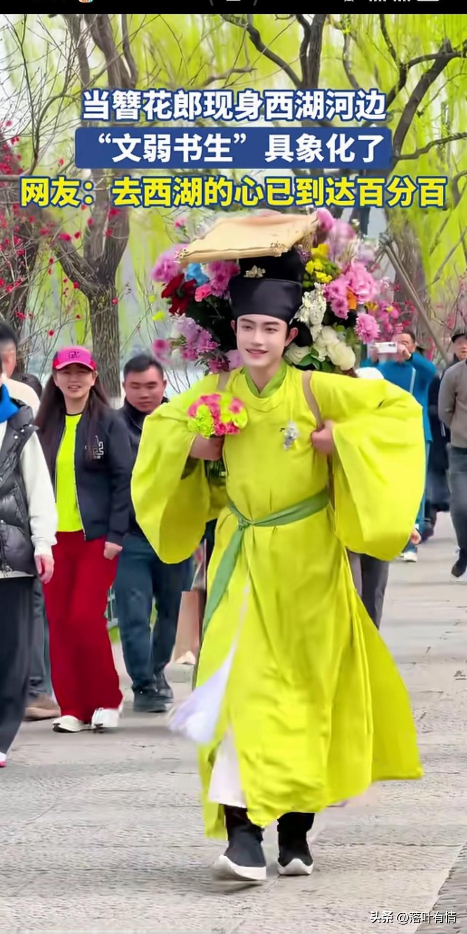 西湖边上又出现了新的NPC, 这次是个玉面小郎君, 穿着黄色的长袍, 带着黑色的帽子, 背上背着竹筐, 里面很多的鲜花, 迈着轻盈的步伐, 走在西湖的边儿上, 迅速引响了游客的关注, 还真的是簪花郎, 以前只听过这个词, 现在终于见到了真人版的, 感觉真的是栩栩如生, 文弱书生就是不一样, 扮起来簪花了也是一绝, 视频录制完毕之后, NPC就把背上的花儿送给了周围的游客,游客都非常的开心, 现在的年轻人实在太会玩了, 能想出来这个创意的人绝对是天才, 大家觉得西湖边上的簪花郎帅不帅? 杭州 西湖暖男造型 杭州男菩萨 西湖才子