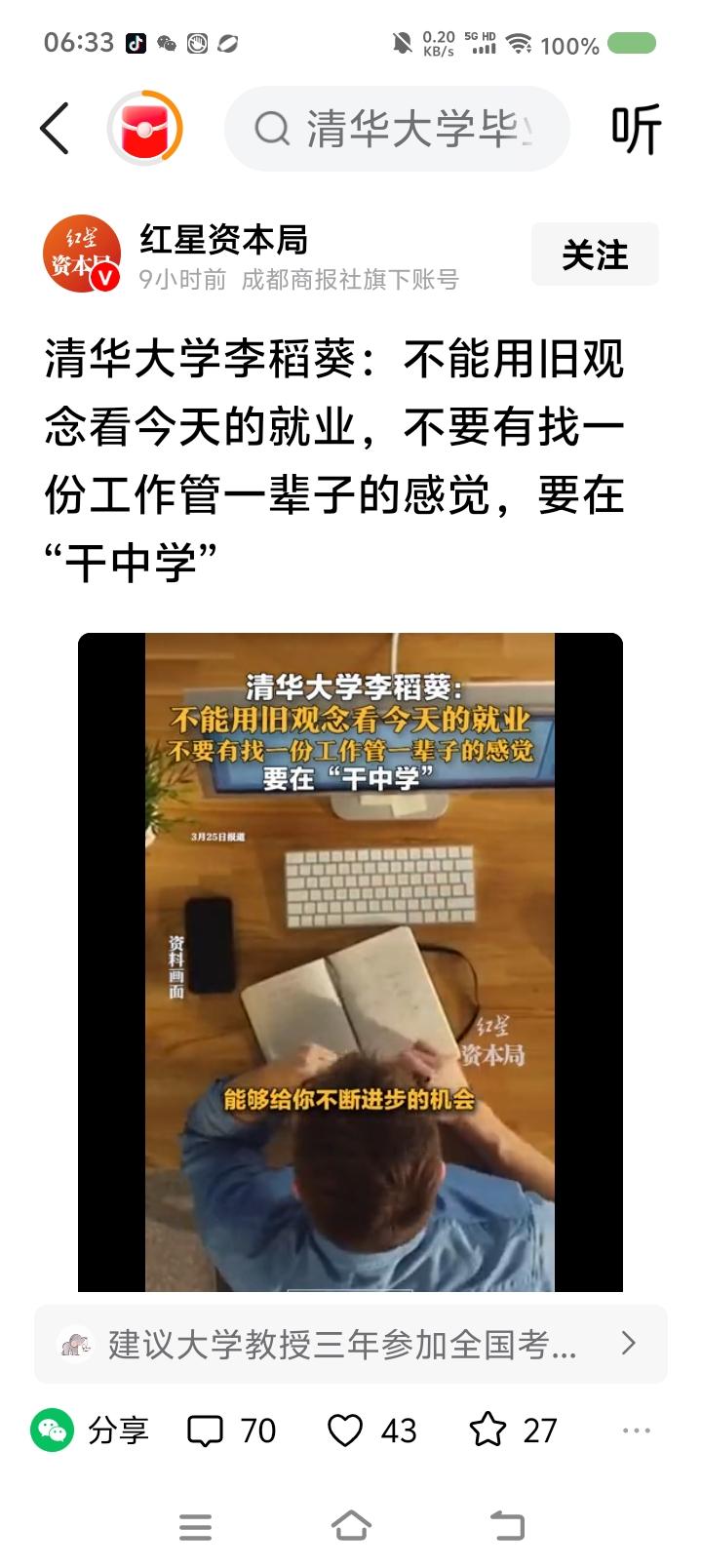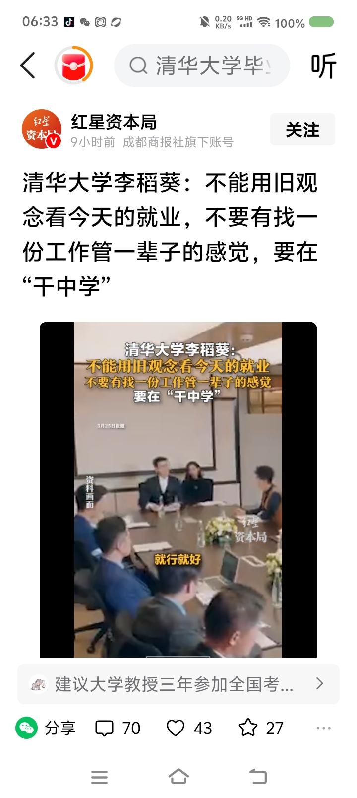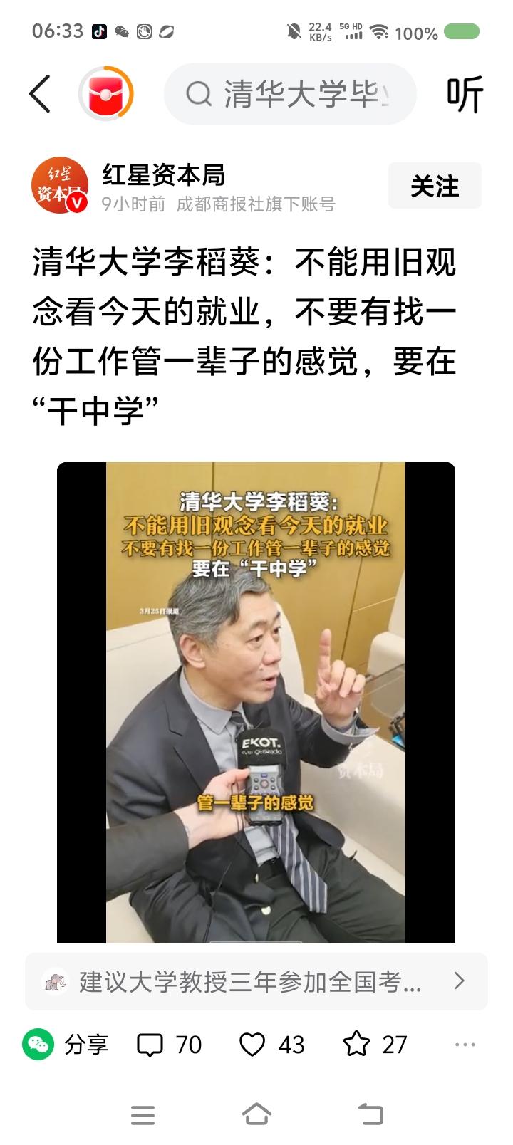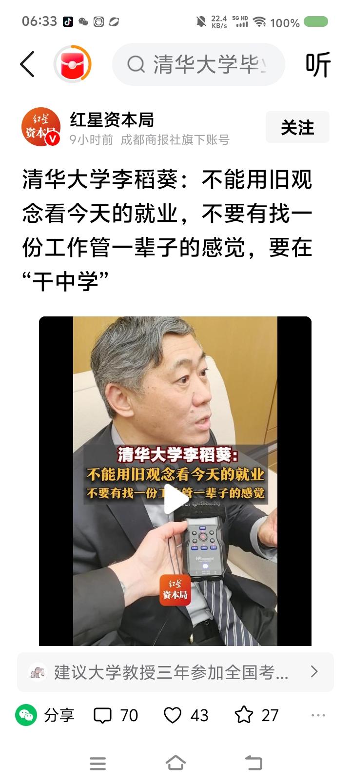 清华的李老师,你咋想的?—— 据报道,清华的李老师说:“不要用旧观念看今天的就业