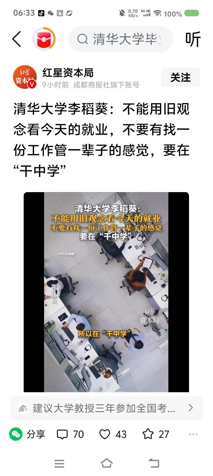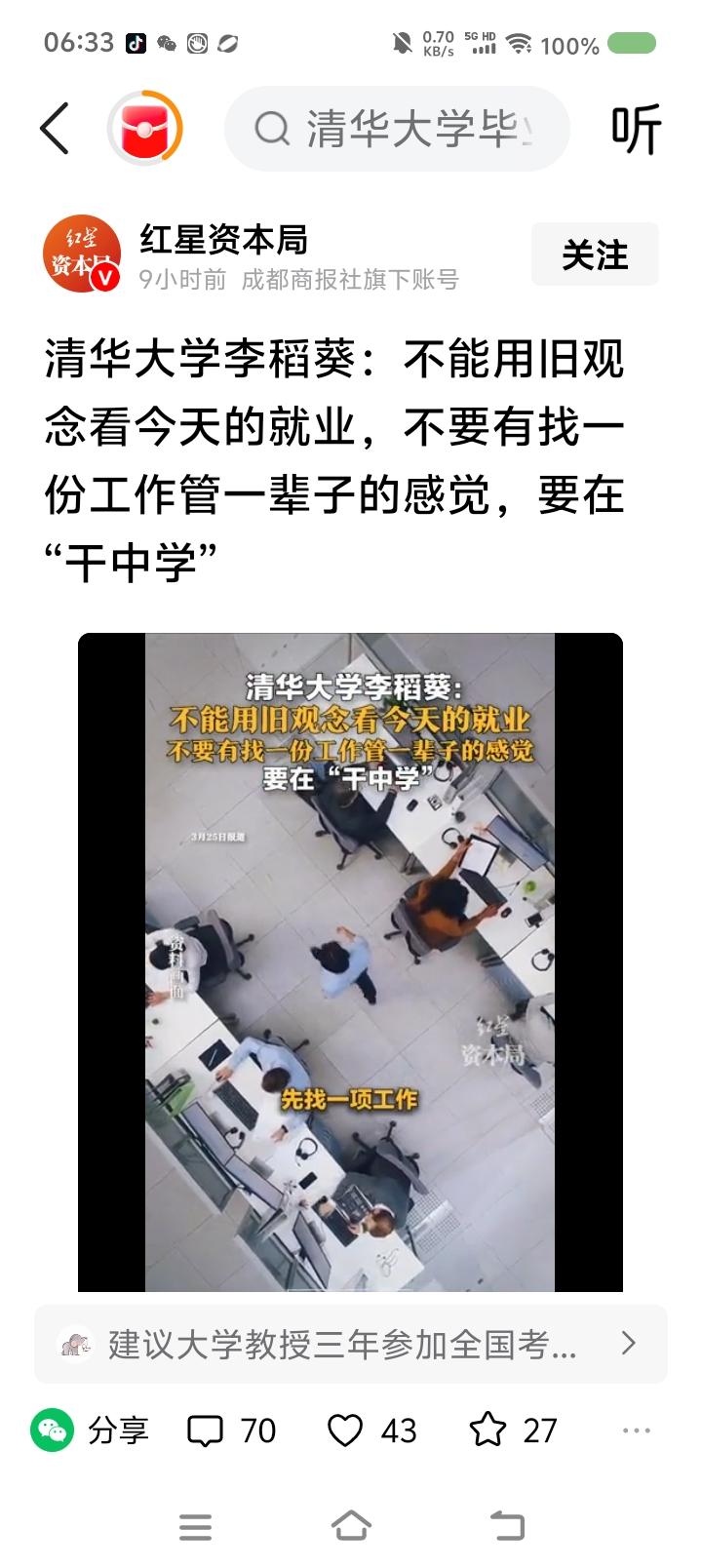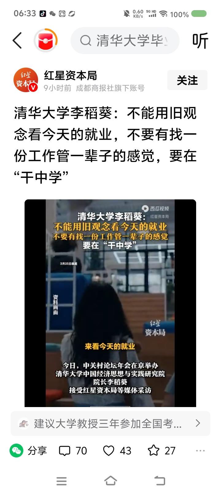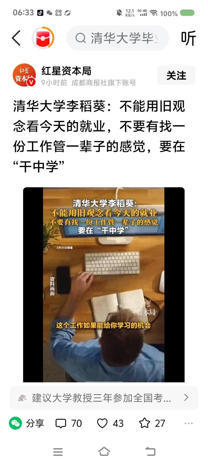 清华的李老师,你咋想的?—— 据报道,清华的李老师说:“不要用旧观念看今天的就业