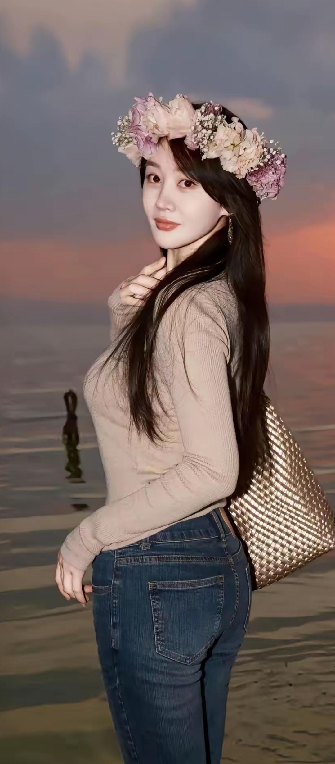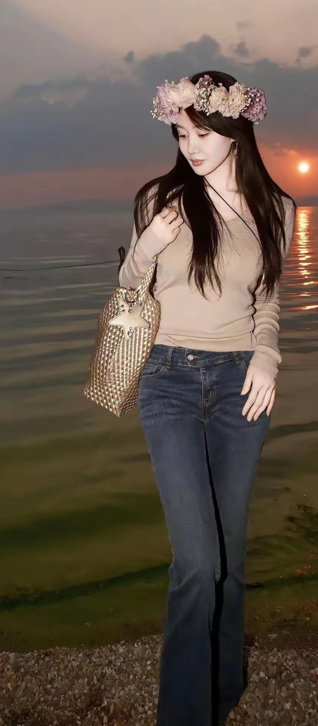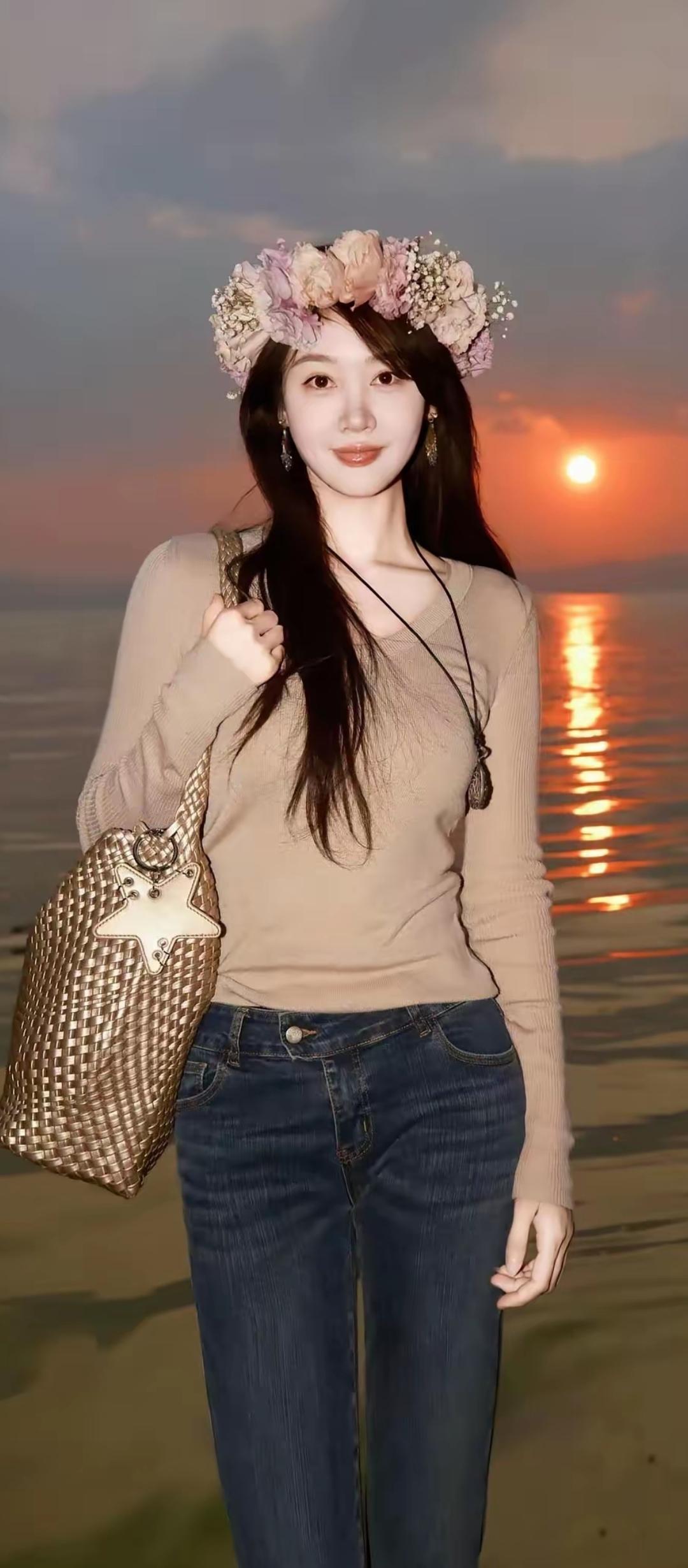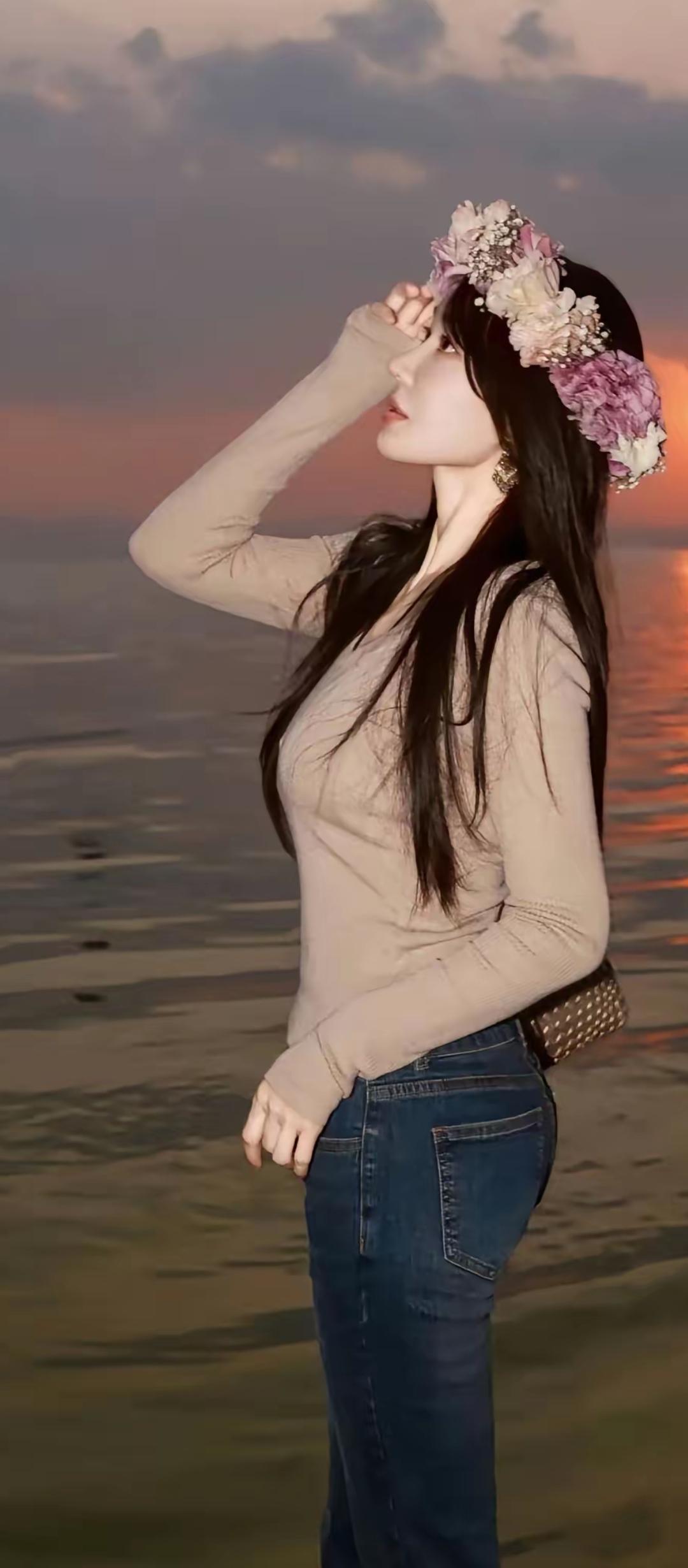 落日余晖映水波,花环美人倚湖畔。