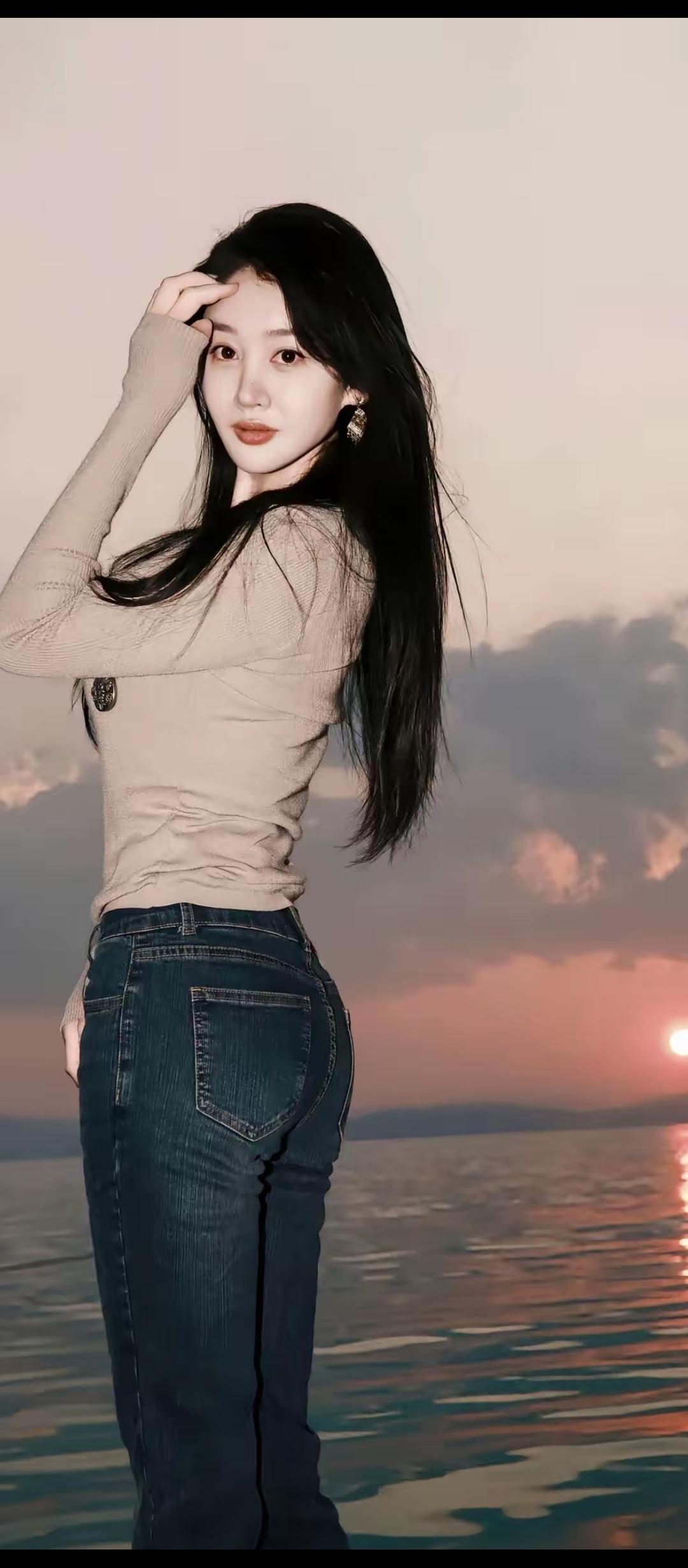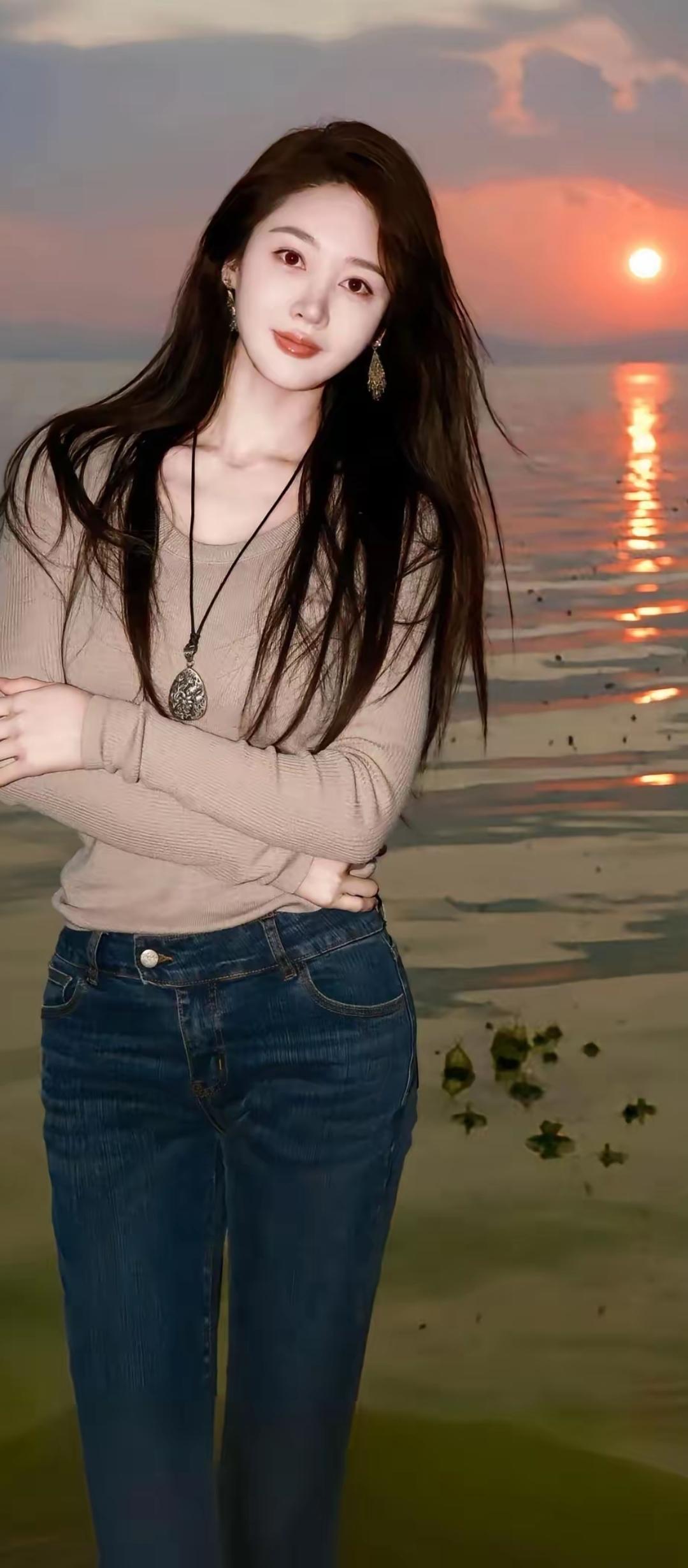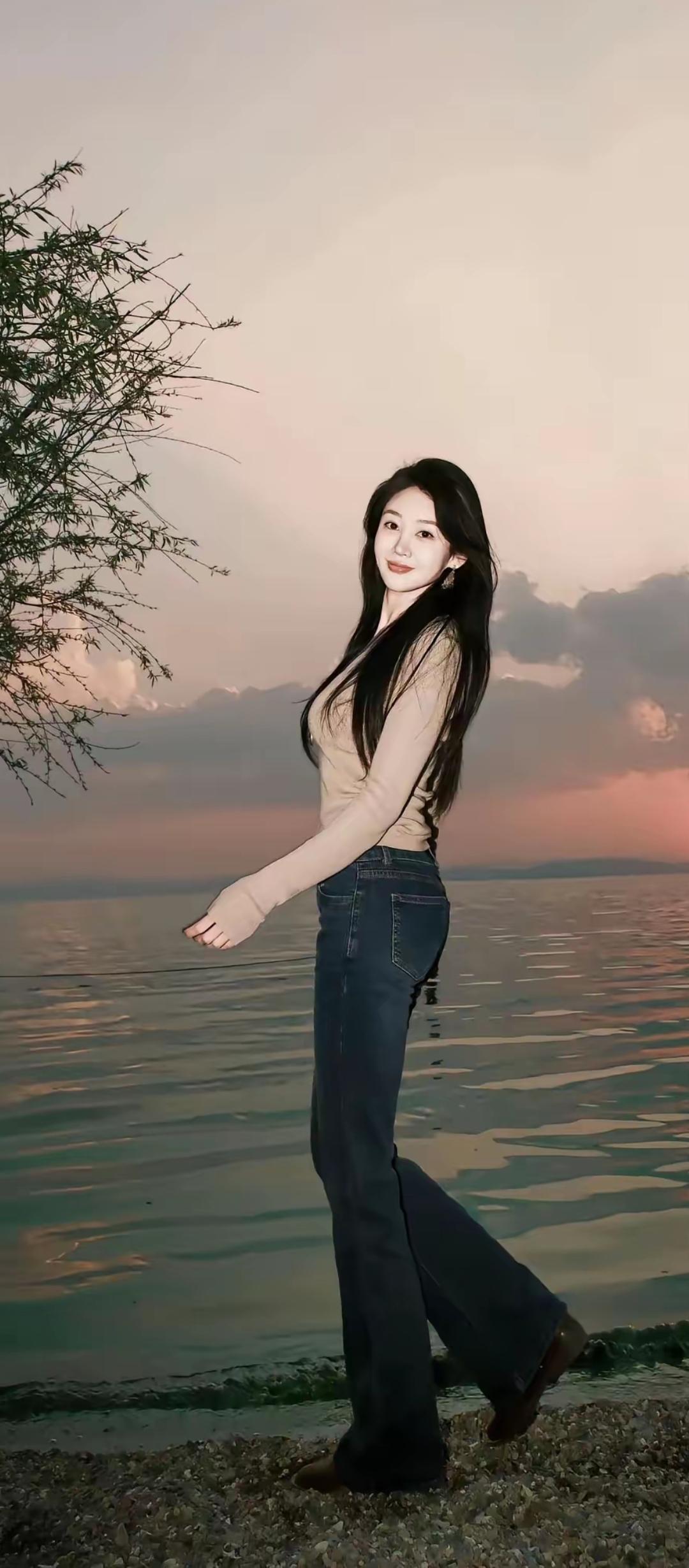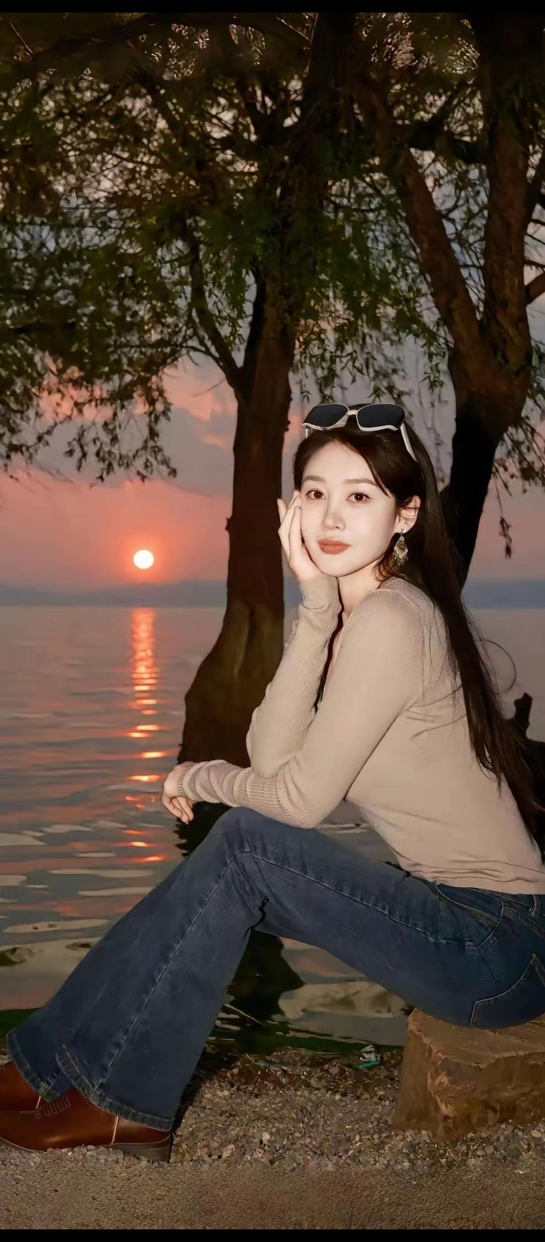 落日余晖映水波,花环美人倚湖畔。