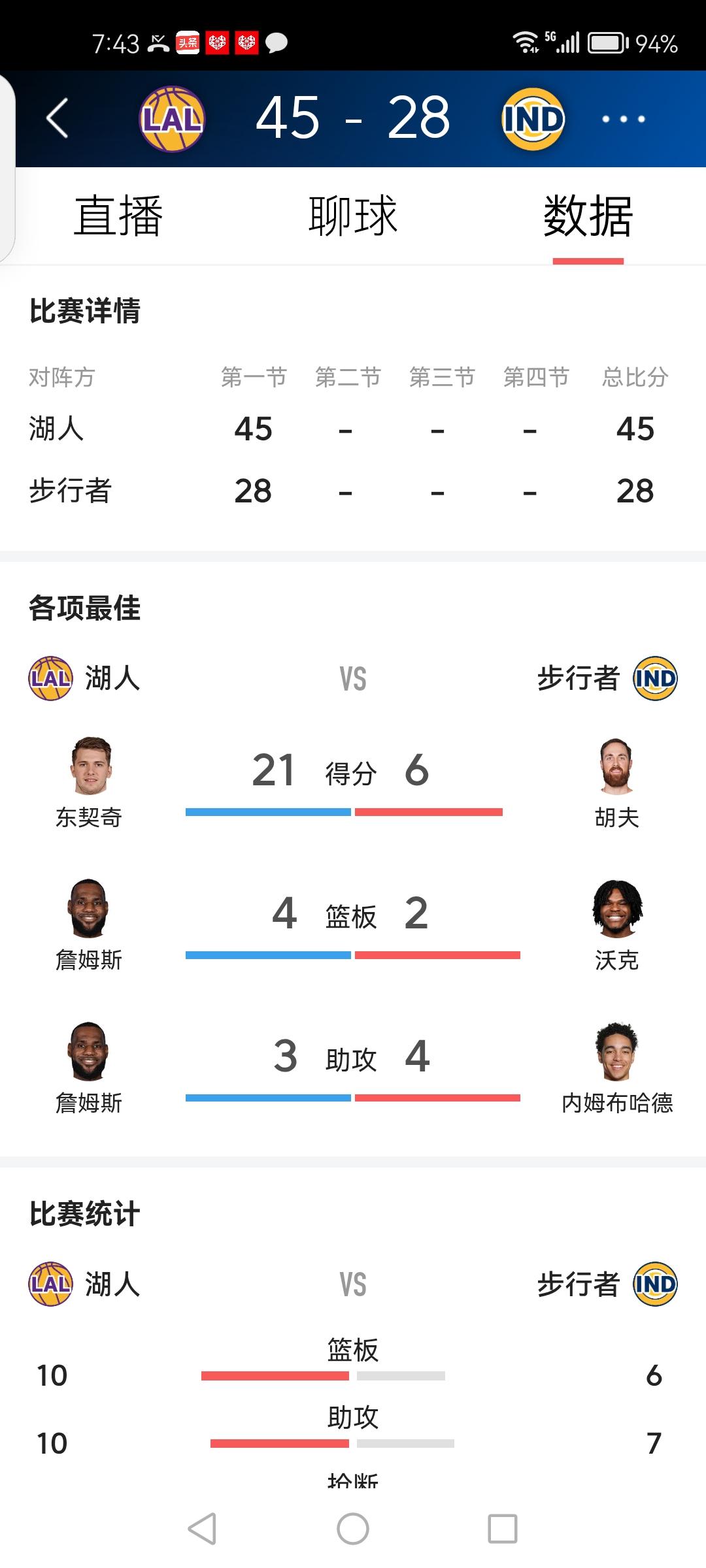 首节战罢,湖人45-28大比分领先,比赛打得轻松又惬意。