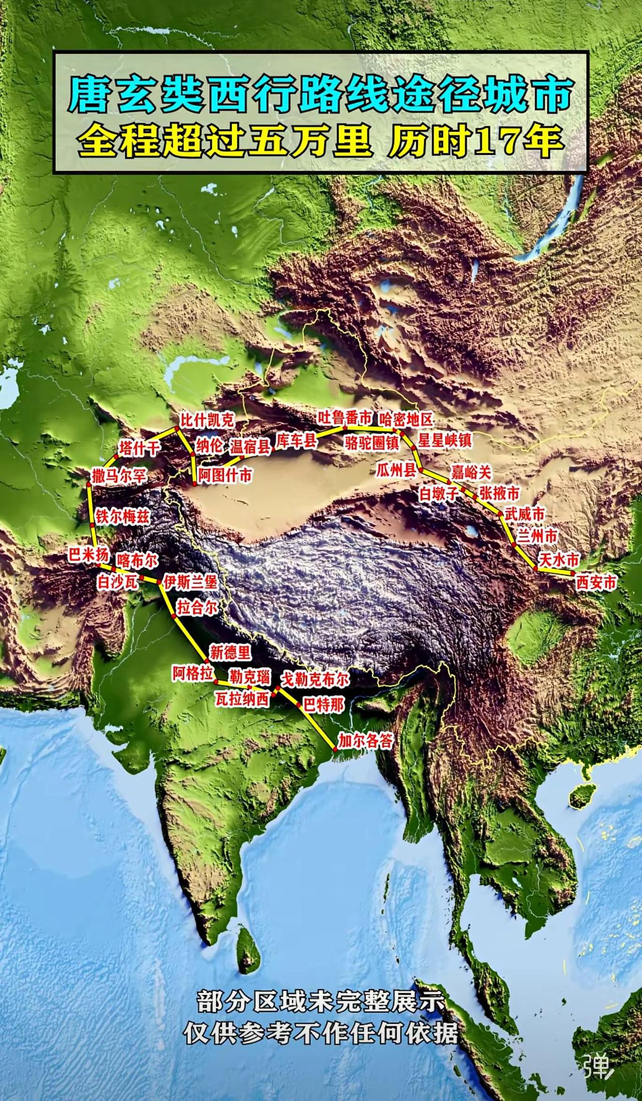 图示唐玄奘西行取经的路线,标注了全程超五万里、历时17年的关键信息,路线从中国西安出发,经兰州、武威、张掖、嘉峪关等西北重镇,穿越河西走廊进入西域,途经哈密、吐鲁番、库车、喀什等城市,再向西跨越中亚的撒马尔罕、塔什干、巴米扬、白沙瓦等地,最终抵达印度的那烂陀寺(新德里、瓦拉纳西、巴特那、加尔各答、勒克瑙、戈勒克布尔、阿格拉、拉合尔、伊斯兰堡等城市为重要节点)。路线以黄色线条清晰呈现,覆盖东亚、中亚、南亚的广袤区域,反映了古代丝绸之路的交通网络与文化交流路径。地图地形渲染直观,突出了青藏高原、帕米尔高原、塔里木盆地等地理障碍,暗示了玄奘西行的艰难险阻。底部标注“部分区域未完整展示,仅供参考不作任何依据”,说明地图的简化性质。整体而言,路线不仅是地理行程的记录,更是中外文化、宗教交流的史诗轨迹,体现了玄奘不畏艰险、追求真理的精神,也折射出古代欧亚大陆文明互动的深度与广度。