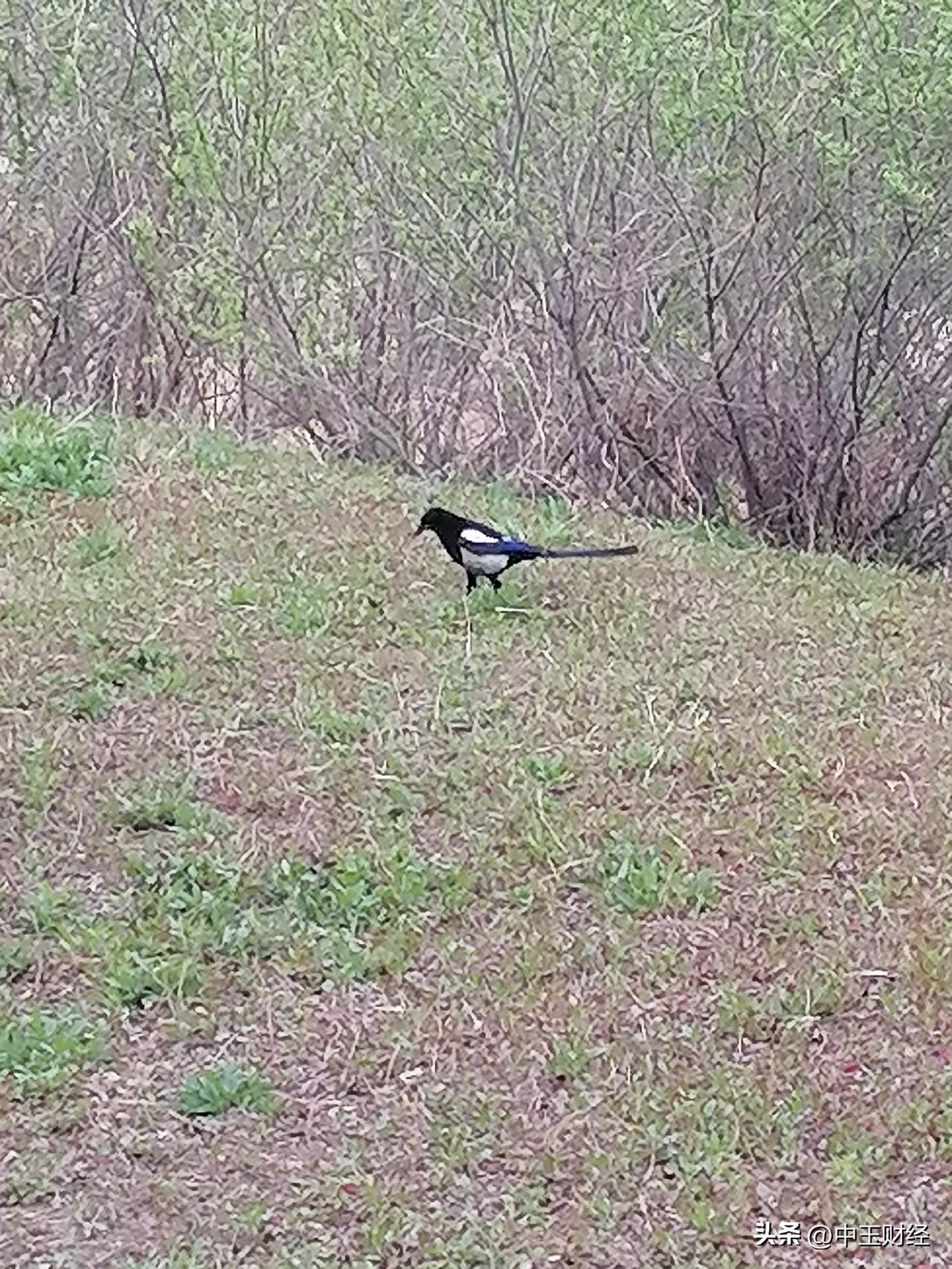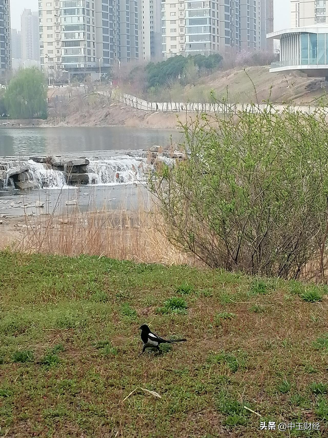 在回家的路上漫步,看到这只可爱的喜鹊在草地上蹦来蹦去,映射出后面的高楼大厦和湖景,感觉到人间喜鹊必有喜事啊!