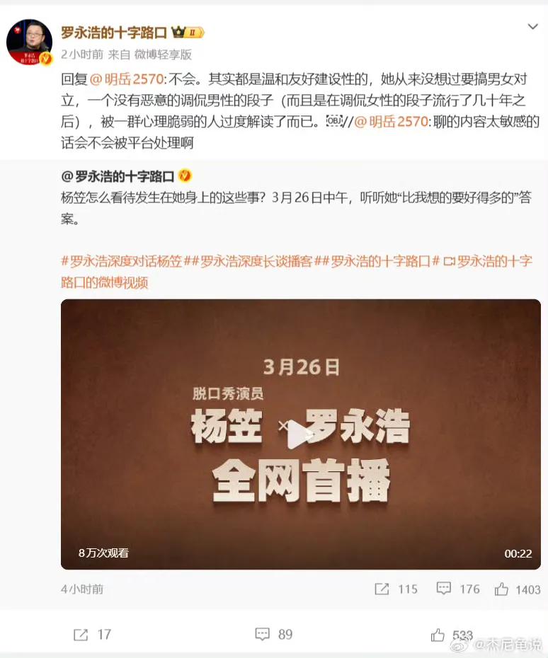 罗永浩这句话的核心意思很直白,可以这样理解: 他认为杨笠在脱口秀里的吐槽,本意并不是真的仇恨、攻击全体男性,更多是一种舞台表演式的调侃、吐槽和段子,并没有真正的恶意。 而很多人对她强烈反感、激烈反击,在罗永浩看来,是因为这些人内心比较敏感脆弱,把玩笑过度当真,进行了恶意化、极端化的解读,才导致了这么大的对立和骂战。 简单总结就是: 杨笠:只是开玩笑,无恶意 骂她的人:太玻璃心,过度解读、上纲上线,你认同吗?