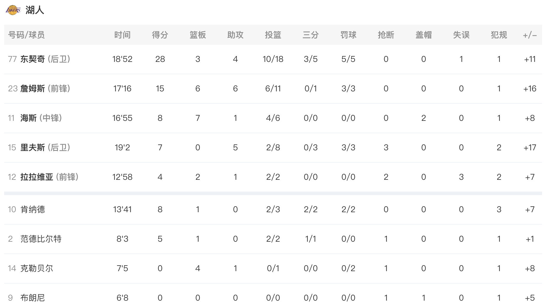 詹姆斯15分6篮板6助攻,东契奇28分3篮板4助攻,里夫斯7分5助攻3抢断,拉拉维亚4分2篮板1助攻2抢断,海斯8分7篮板1助攻2盖帽,肯纳德8分1篮板,范德彪5分1篮板,克勒贝尔4篮板1助攻。