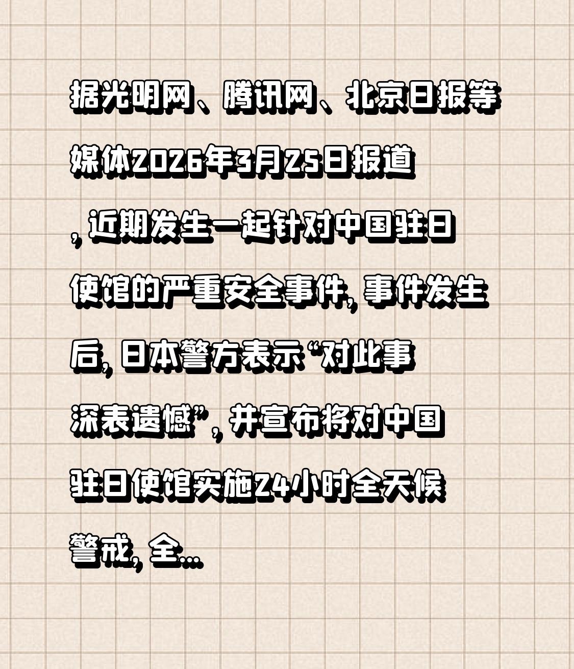 据光明网、腾讯网、北京日报等媒体2026年3月25日报道,近期发生一起针对中国驻日使馆的严重安全事件,事件发生后,日本警方表示“对此事深表遗憾”,并宣布将对中国驻日使馆实施24小时全天候警戒,全面升级安保等级。日本陆上自卫队也表示,将全面配合警方调查,并在查明事实基础上作出严肃处理。 此外,鉴于3月18日发生男子持刀闯入中国驻名古屋总领馆事件,警方已正式下达“要馆舍警护强化令”,从即日起对该馆实施24小时不间断常驻警戒。每日三班轮换警力部署。