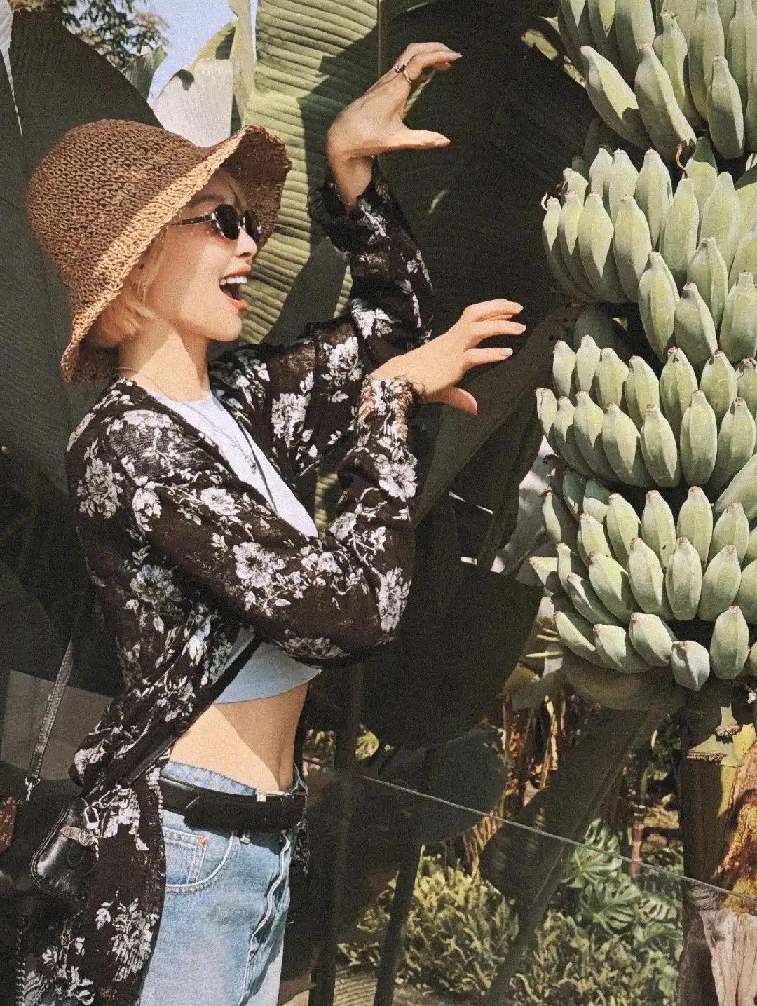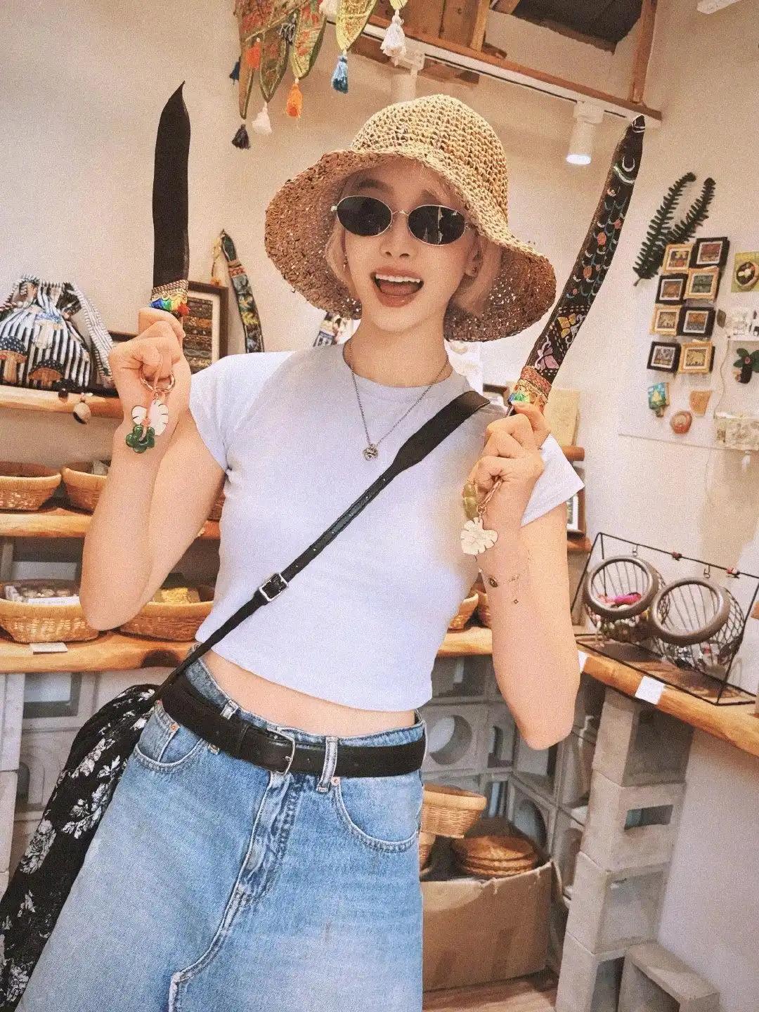宋茜西双版纳旅行照美出圈,露腰短T搭配印花开衫与牛仔裙,时髦文艺又性感,小金毛与