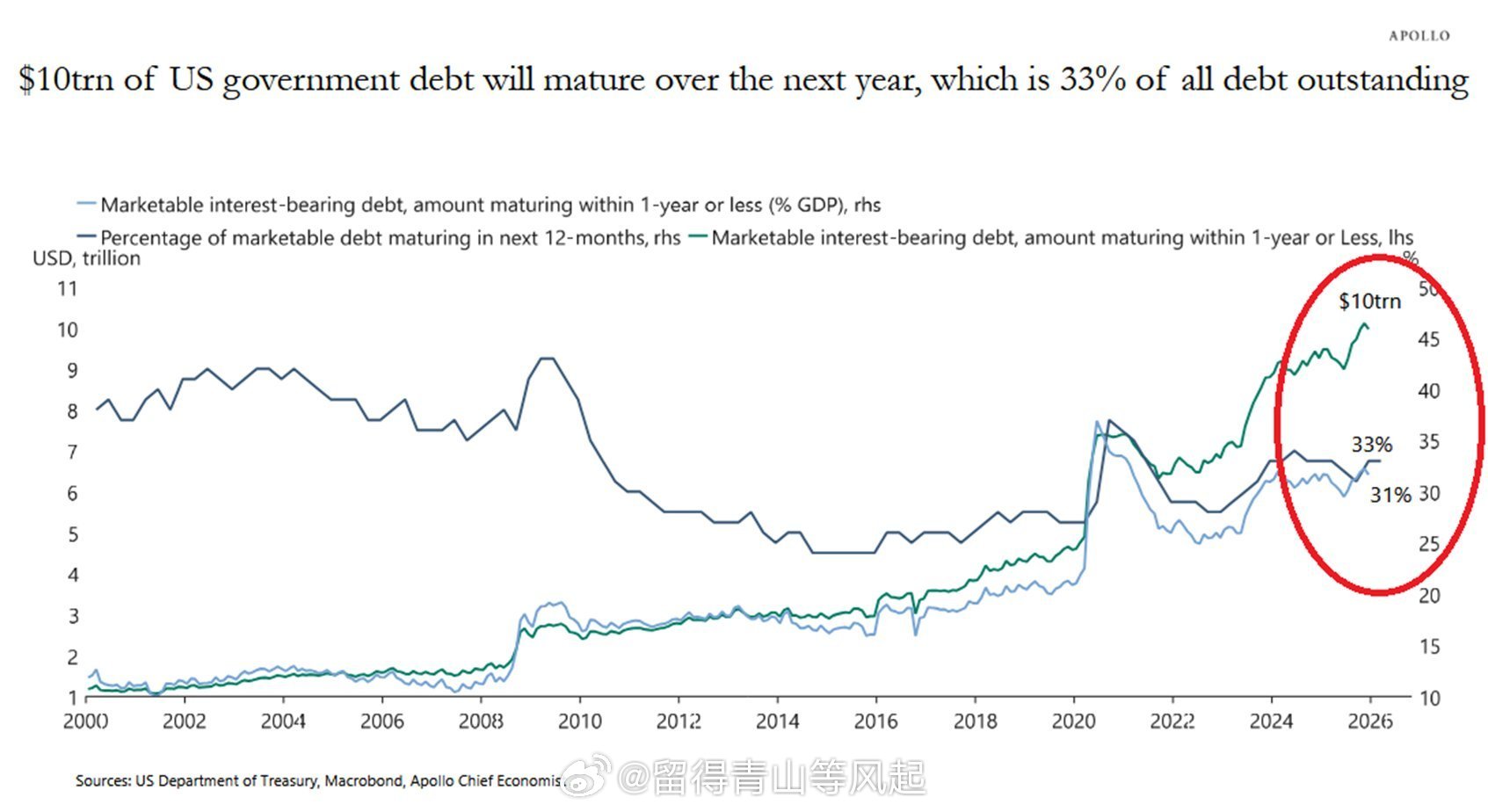 未来12个月内,美国政府的债务有10万亿美元将到期,创下历史新高。并且,这占到所有未偿还可流通债务的33%,是有记录以来最高比例。