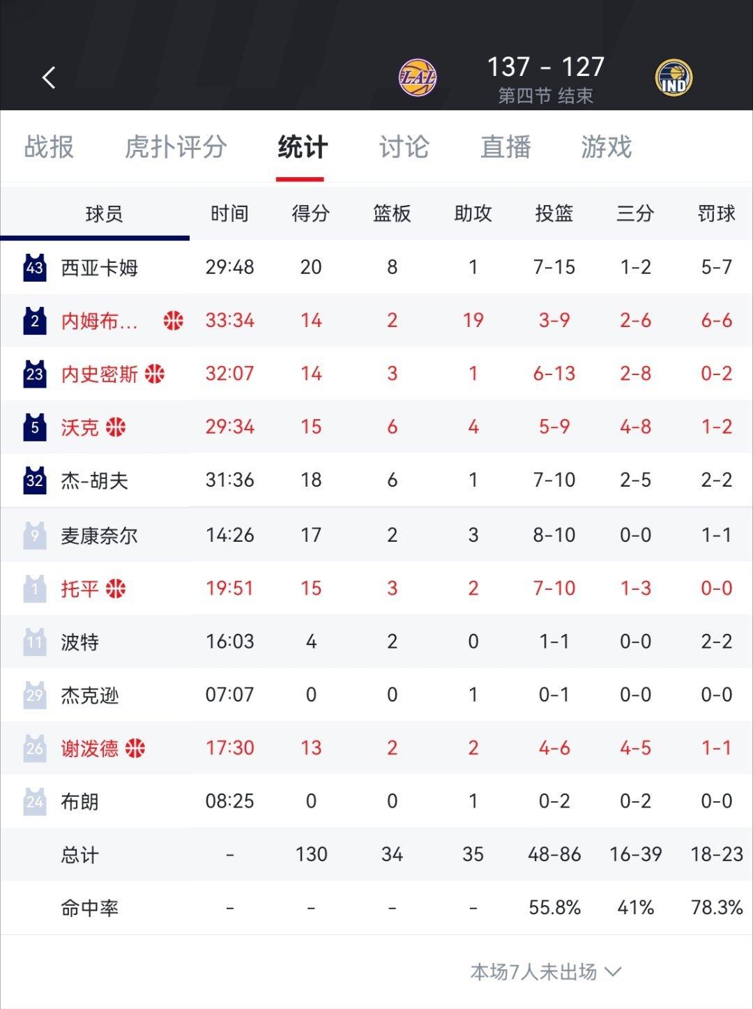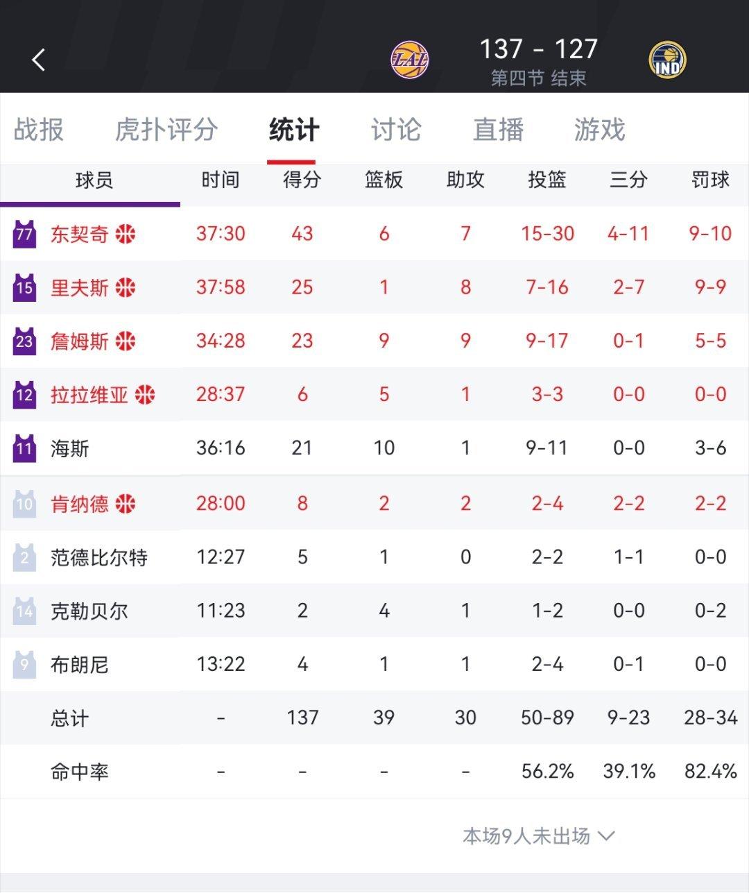 毫无悬念,虽然有点惊险!湖人137-130战胜步行者! 最后五分钟进入了危险区?浪费着说多不多的领先分数,渐渐没有了,本来指望着能休息的老哥几个,最后还要上来再稳一稳。 可怜天下父母心,詹姆斯向雷迪克反复确认是不是要换布朗尼上场,得到确认后,喜笑颜开的跟儿子一起登场。