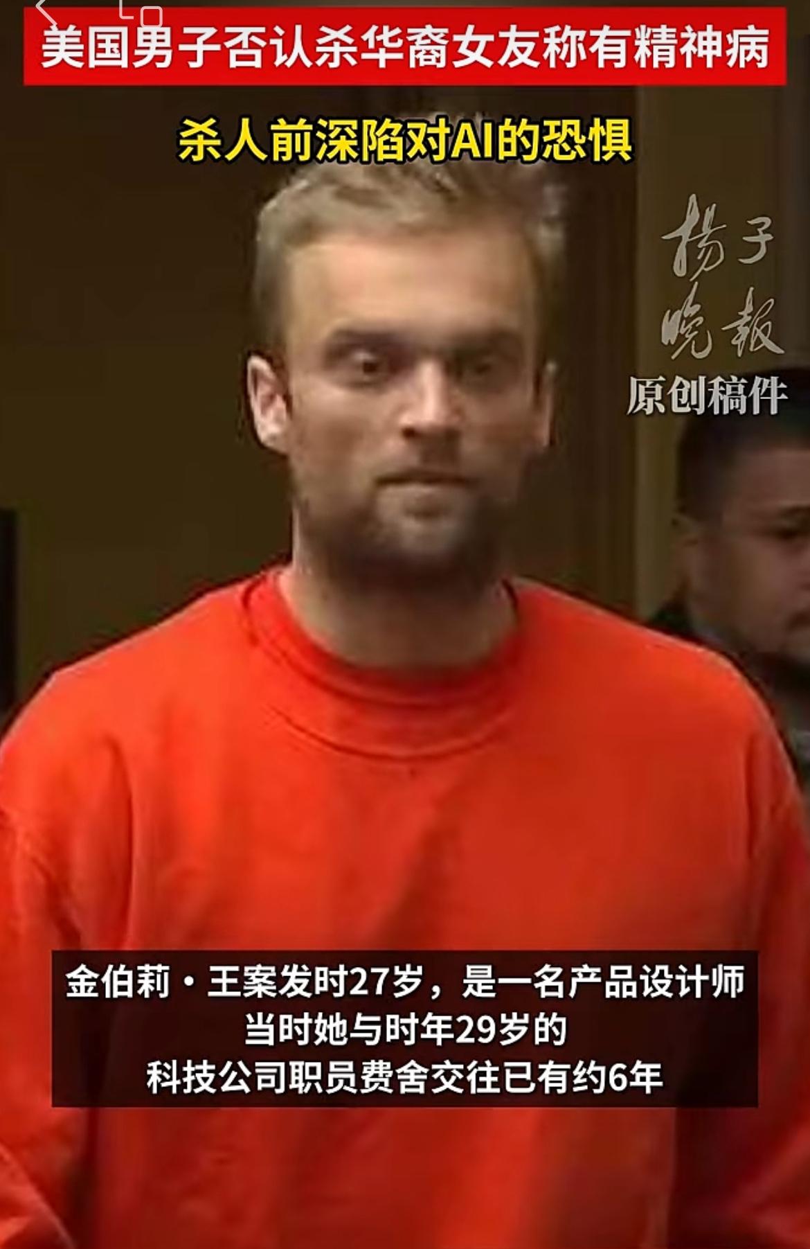 美国 27 岁华裔女子被同居 6 年男友杀害,因为得了 AI 恐惧症,临上法庭却精神异常。这名女子叫金伯莉.王,是一名产品设计师,她的男友是一名白人,叫菲舍,两人在一起同居 6 年。2023 年,她的男友费舍表现出对 AI 的恐惧,极度的烦躁、易怒。本来两人已经分开居住,但11月30日那一天,两人经不住诱惑,又回到同居的公寓,结果悲剧发生了,事后男子被送往精神病院治疗。经过法院多次审理,男子始终不认罪。拉锯了两年,在 2026 年 3 月 23 日终于上到法庭,男子却再一次精神异常,不得不推迟审判。明显男子是在装病,因为如果罪名成立,将判 25 年或终身监禁。
