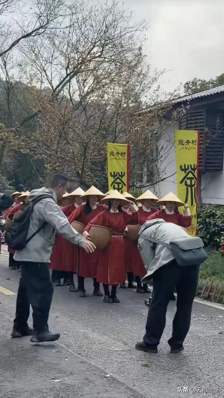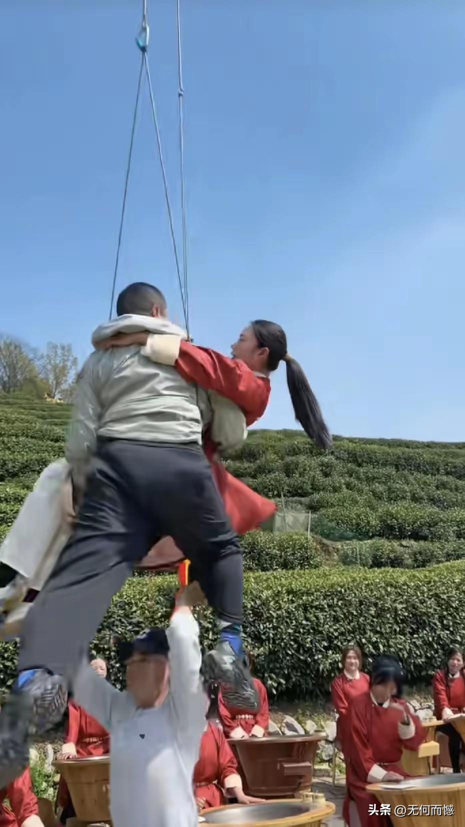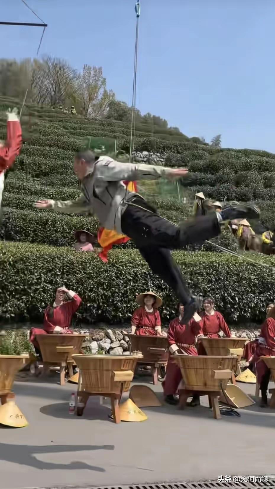 李亚鹏先生茶园飞檐走壁”,张纪中坐镇指导,看着太有画面感了!3月25日,在杭州龙井村的茶园里,李亚鹏吊着威亚在半空中腾云驾雾,展现了英雄救美的情景,她在空中一把抱住了红衣姑娘,再现了武侠剧里大侠的形象。周围一群穿红裙戴斗笠的茶农姑娘,捧着竹筐看热闹,连路边的游客都忍不住弯腰鞠躬,这阵仗比拍古装剧还热闹。从吊威亚到互动摆拍,茶园变成了武侠片场,连空气里都飘着茶香和笑点,为李亚鹏先生点赞!