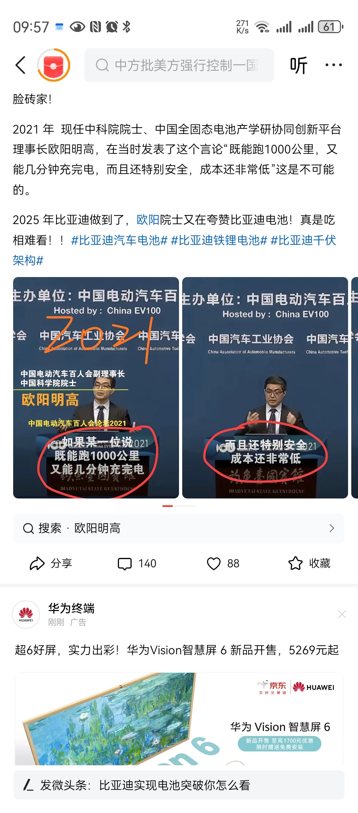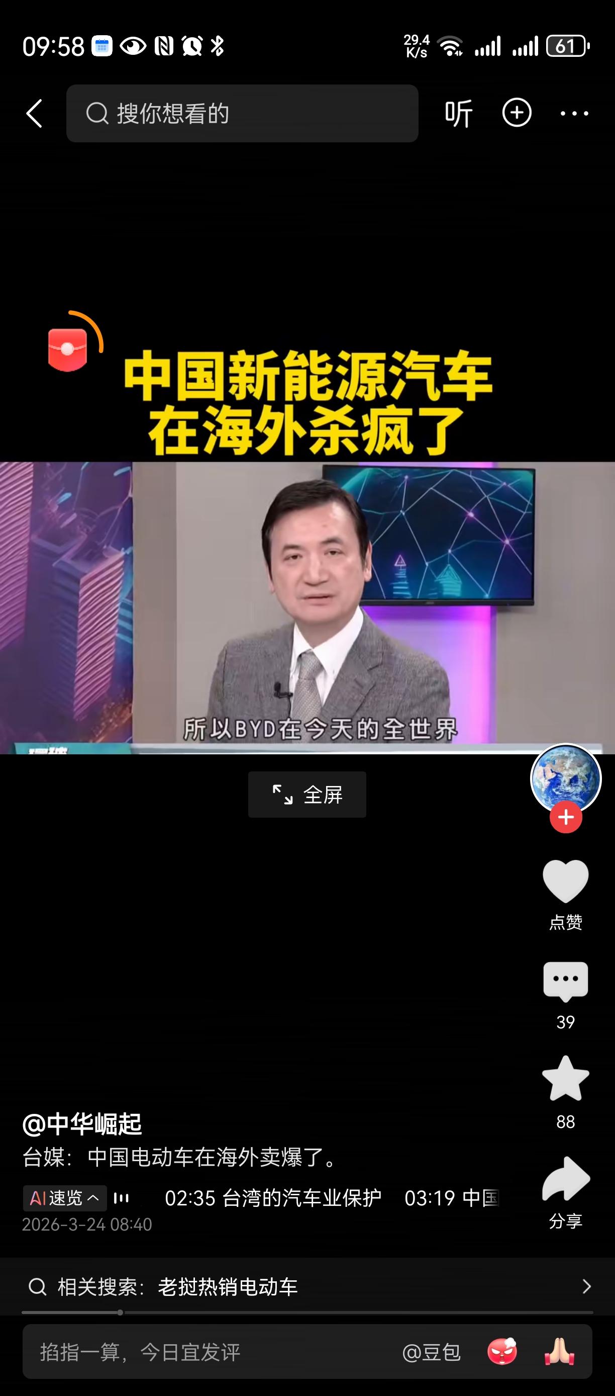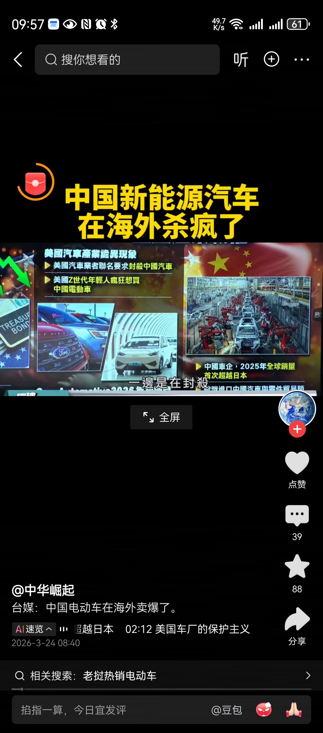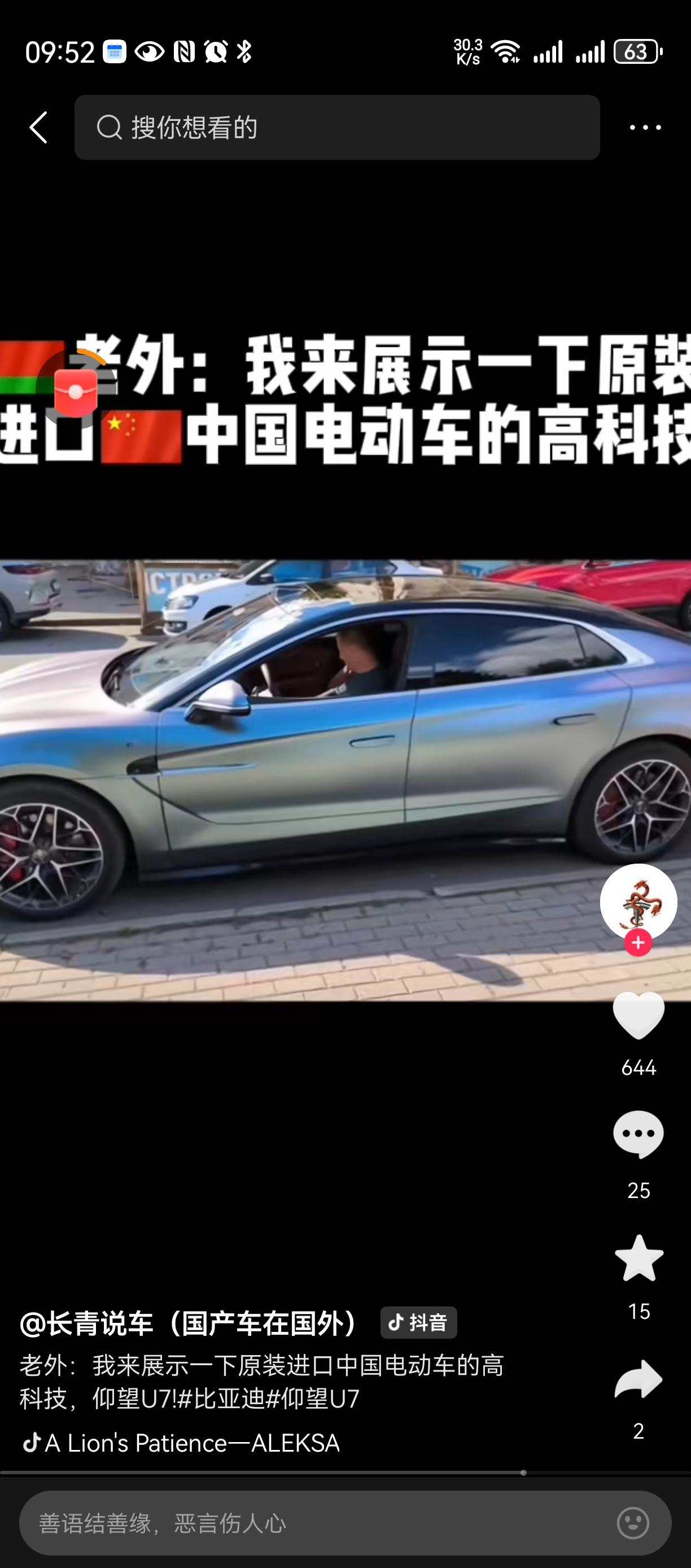 买中国产车,新能源老外看中国汽车 喔喔, 已经成为全球趋势。。。 随着汽油价格居高不下, 新能源车赢麻了。。。 比亚迪,华为就是中国的代表 搞了稀缺资源, 贵族版全球限量30架。。。 闪充电, 平移停车, 过河。。。。 国产汽车全球化 国家需要这些高科技企业[赞][赞][赞]