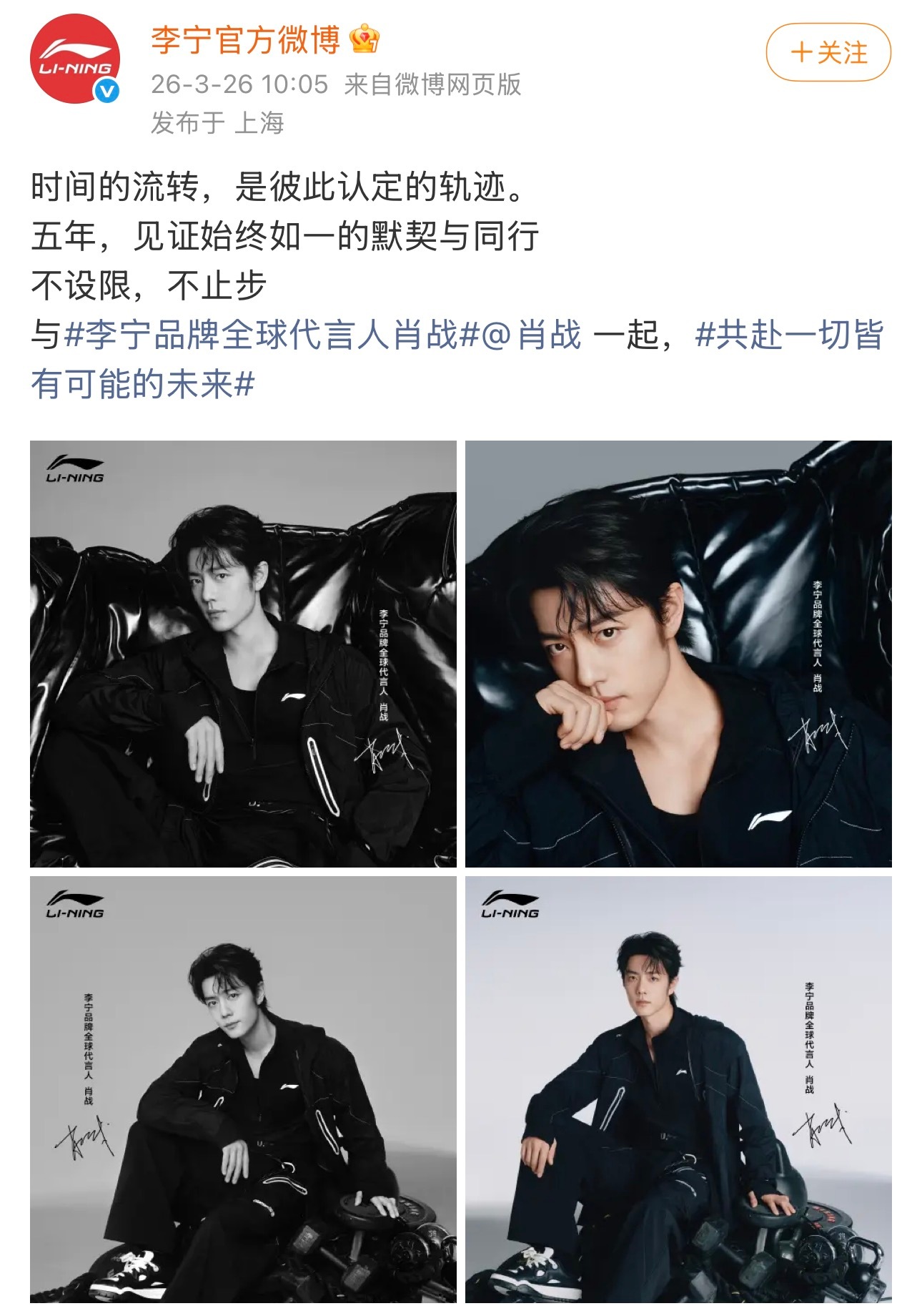肖战x李宁 又一个长代,第六年了!而且是李宁品牌唯一全球代言人。