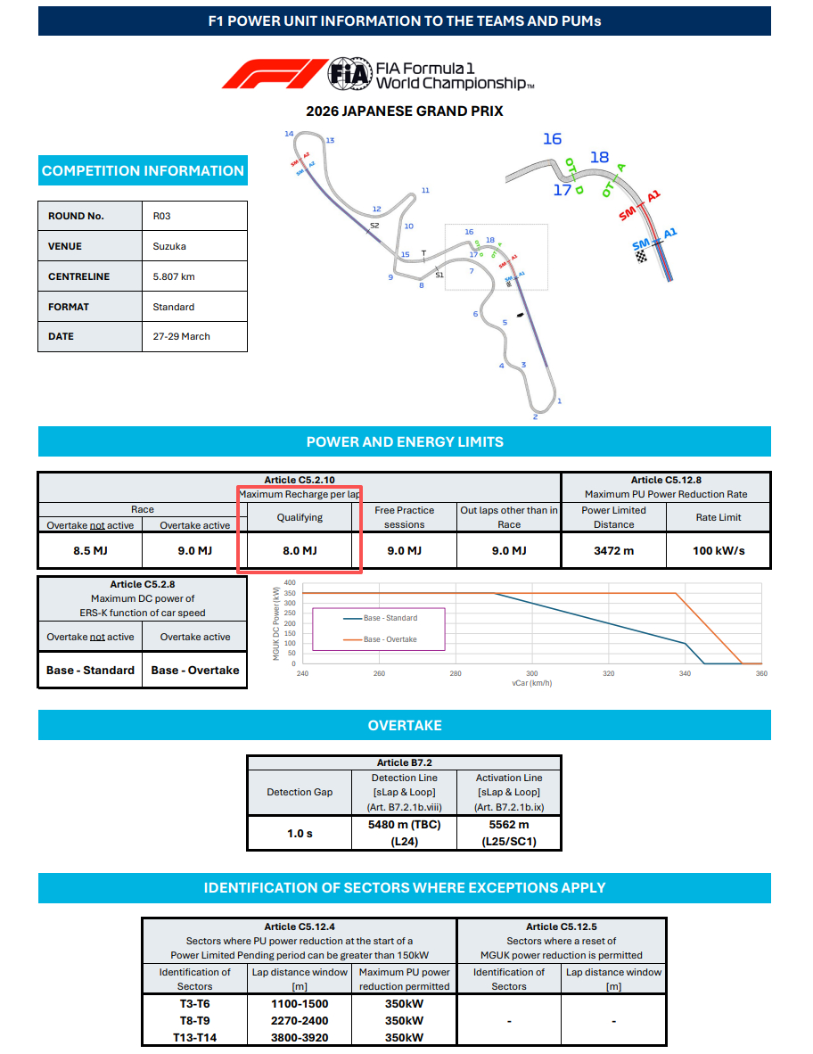 FIA官方宣布,日本大奖赛排位赛单圈最大可回收能量从9.0MJ减少为8.0MJ,此举得到了所有动力单元供应商的一致支持。