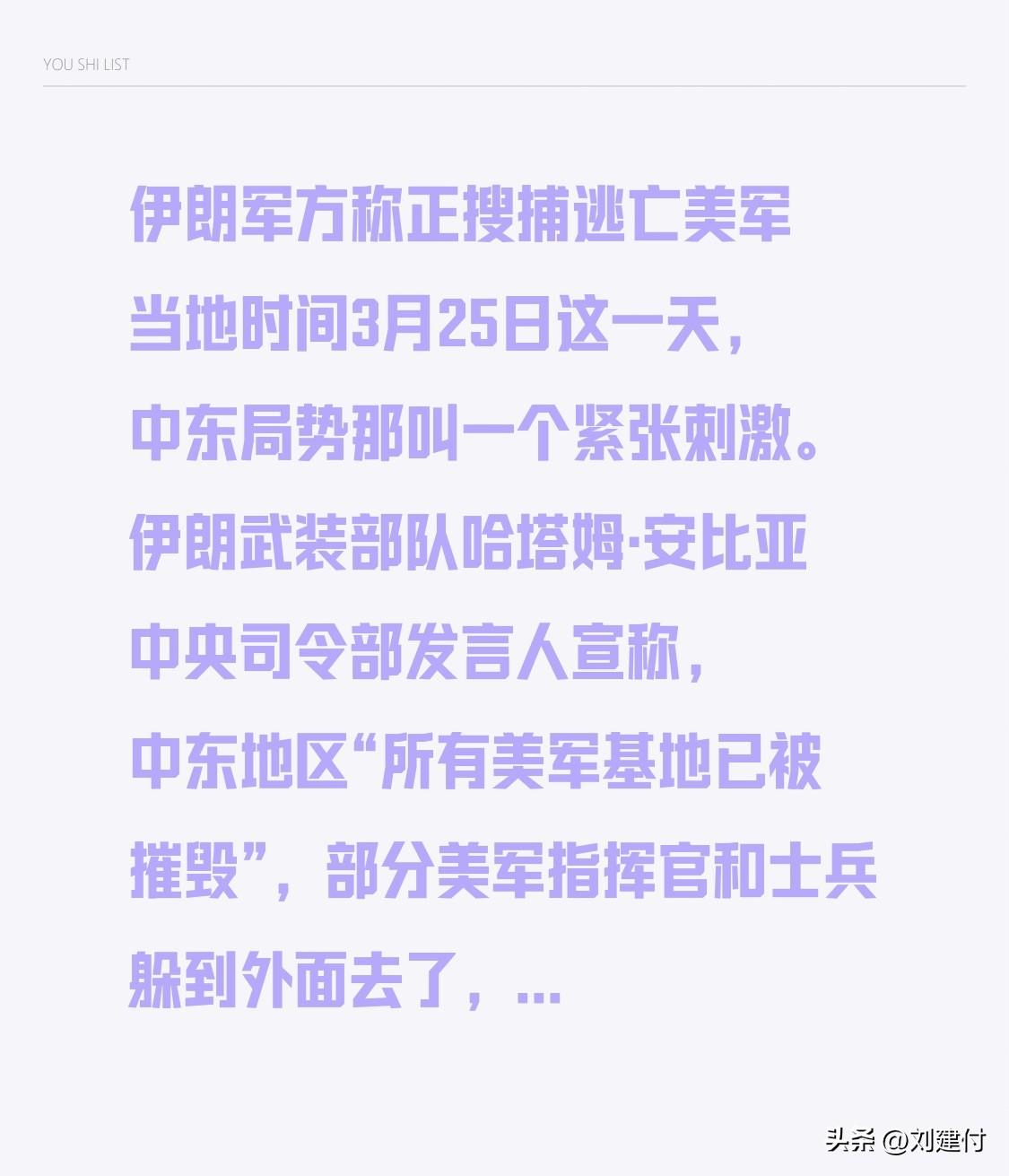伊朗军方称正搜捕逃亡美军 当地时间3月25日这一天,中东局势那叫一个紧张刺激。伊朗武装部队哈塔姆·安比亚中央司令部发言人宣称,中东地区“所有美军基地已被摧毁”,部分美军指挥官和士兵躲到外面去了,伊朗军方正全力搜捕。还呼吁地区国家民众提供线索,让大家把美军“逐出”该地区。 同一天傍晚,伊朗伊斯兰革命卫队发动“真实承诺4”第81波打击,用了多种精确制导导弹,打了以色列70多处目标。而以色列总理内塔尼亚胡则说会继续全力空袭伊朗。这局势真是剑拔弩张,不知道后续还会怎么发展。