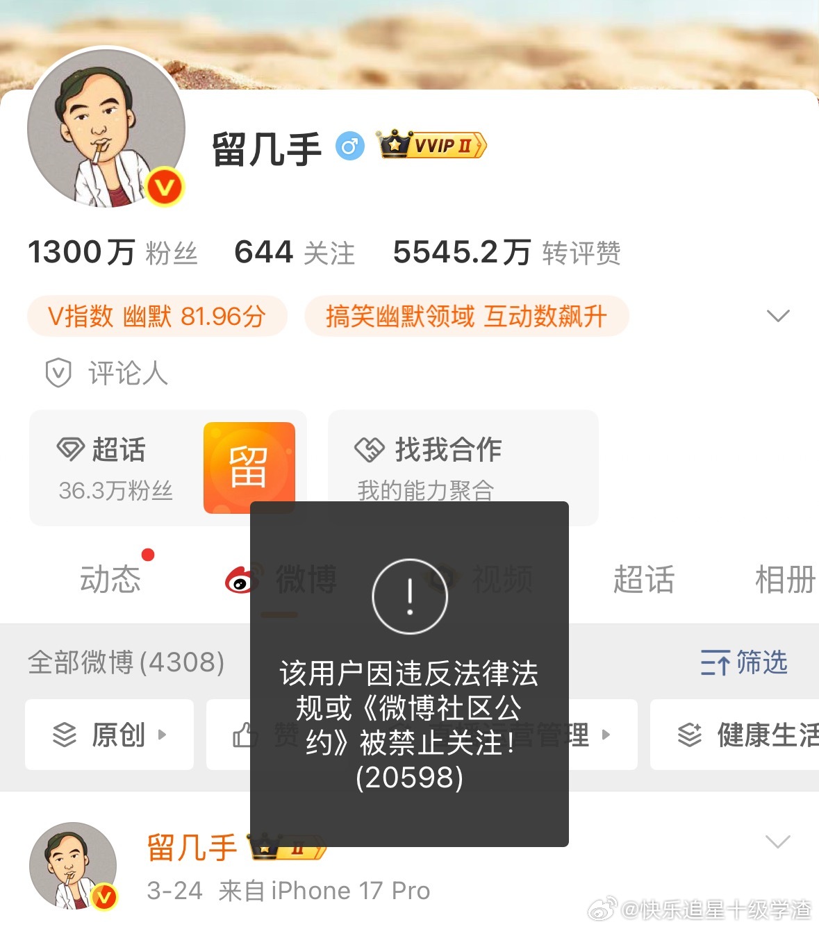 留几手昨天雷霆发言之后 现在微博被禁止关注了