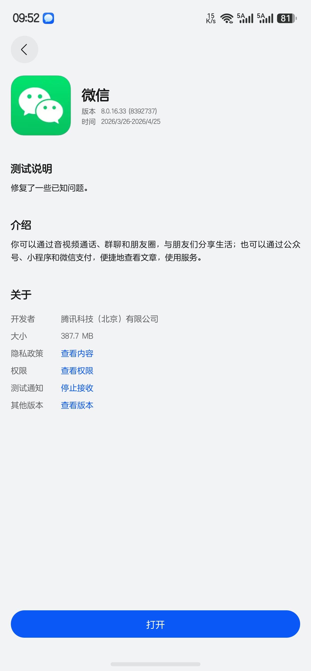 鸿蒙微信8.0.16.33版本又进行了内测邀请,昨日还是8.0.16.16版本,今日已更新至33。然而,更新后并未发现明显的新功能,可能是我们不太常用的功能得到了更新,或者是在等待后续的动态更新。安卓版本已更新至8.0.69,按照这个速度,不久后应该就能与安卓版本保持一致。目前最大的问题是还不能自定义铃声。已经安装该版本的用户,有发现新的功能吗?