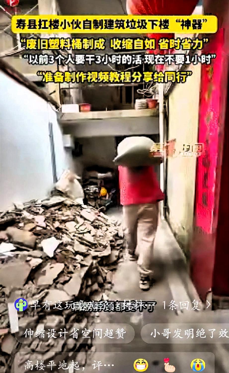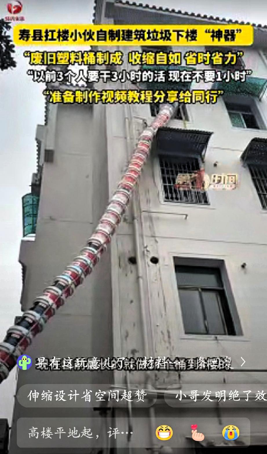 “太有智慧了!”安徽寿县一位从事搬运工作的小伙,在长期劳作中深感其苦,便动手改良,用日常废品做出了实用工具。小伙利用废弃塑料桶,切除底部后相互套接,搭建起一条从楼层到地面的简易滑道。 这套装置可自由伸缩,展开长度足以覆盖高层作业,收纳后体积小巧,不占用场地。投入使用后,垃圾可直接沿桶体滑落,省去了人工肩扛手提的繁琐。 据测算,以往需要三人耗时数小时的工作量,如今单人在一小时内即可完成,大幅降低了劳动强度,提升了作业效率。该方法取材方便、成本低廉,对一线工人具有很强的实用性。 小伙表示,愿意将制作方法整理成教程,分享给更多同行,帮助大家减轻负担。此举获得网友广泛认可,认为这是源于生活的实用智慧,值得肯定与推广。 真正的创造往往来自实践中的思考,普通劳动者凭借经验与巧思,用简单方式解决实际问题,这种踏实的智慧值得尊重。