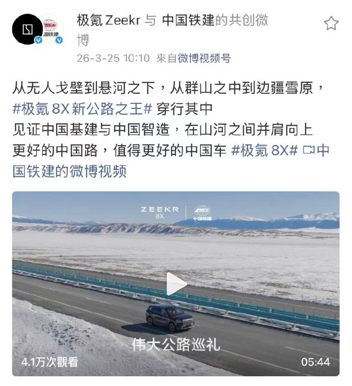 极氪和中国铁建这波联动上了,也是没想到啊。基建狂魔邀请新公路之王去打开,说走就走。中国铁建以大国公路为考场,极氪8X穿越多种复杂地貌,全面展示高性能旗舰实力。以硬核实力穿越各种路况,证明自己,新公路之王稳了。 更好的中国路,成就更好的中国车;更好的中国车,不负更好的中国路。【来自懂车帝车友圈】