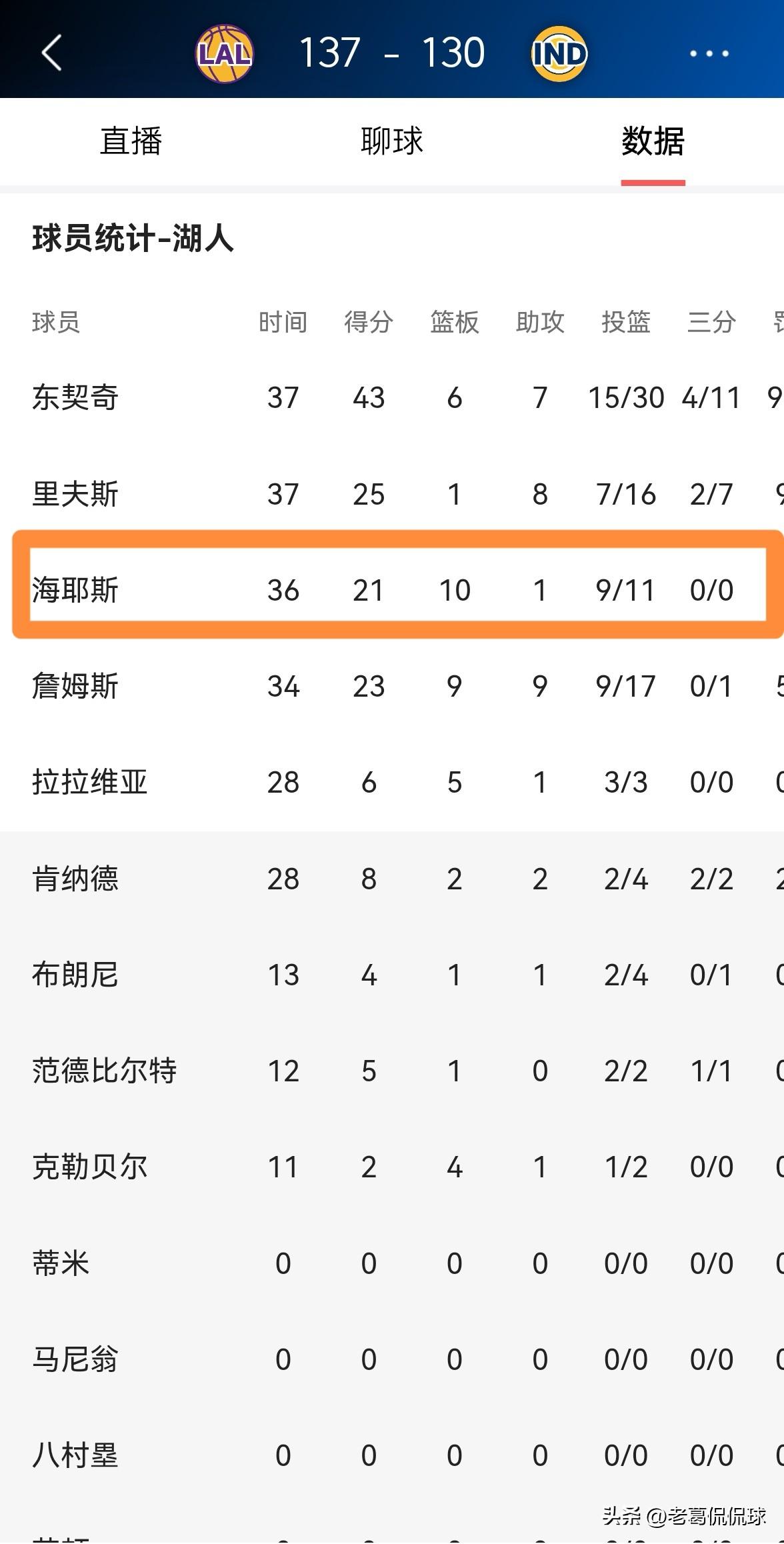 湖人中锋海斯真是彻底的吃撑了!在今天湖人客场以137:130击败步行者的比赛中,海斯在篮下得吃得喝,被三大传球高手东契奇、詹姆斯和里弗斯喂的饱饱的。 整场比赛下来,海斯首发出战36分钟,投篮11中9,其中罚球6中3极其高效的砍下21分,外加10篮板2抢断2盖帽,他的场上正负值为+2。 事实证明,海斯比艾顿更适合首发中锋的位置,当海斯出任球队的首发五号位时,湖人三巨头和海斯之间的配合更出色。