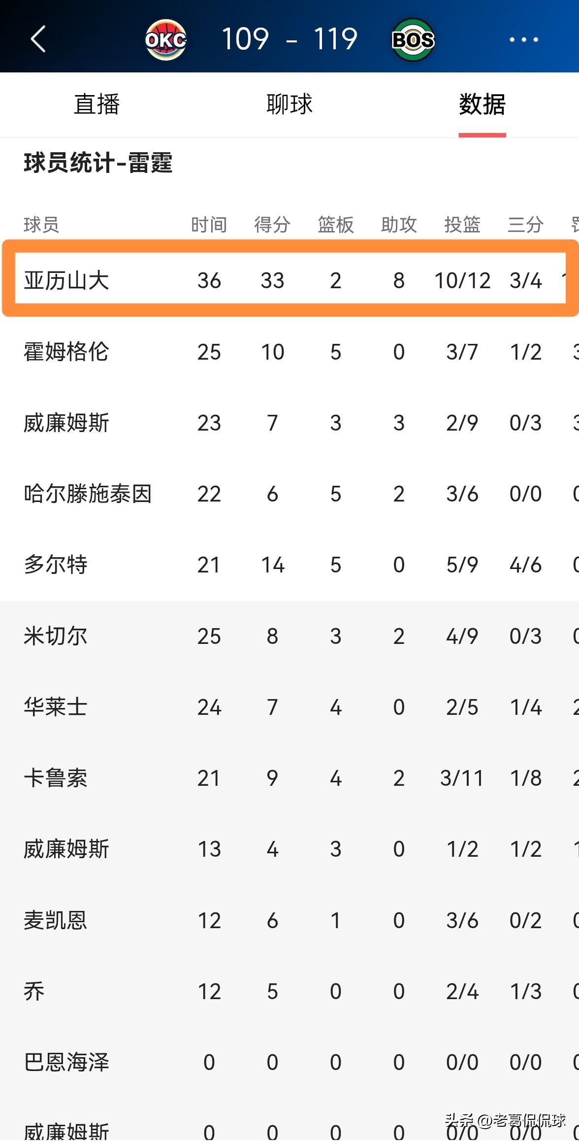 雷霆超级巨星亚历山大终于老实了!在今天雷霆客场以109:119输给凯尔特人的强强对话中,纵然亚历山大爆砍33分却依然无力回天。 整场比赛下来,亚历山大首发出战36分钟,投篮12中10,其中三分球4中3、罚球12中10空砍33分,还有8助攻2抢断。 随着雷霆的失利,向来比较嚣张的亚历山大终于变得老实了,当比赛结束以后,亚历山大看起来非常的低落。