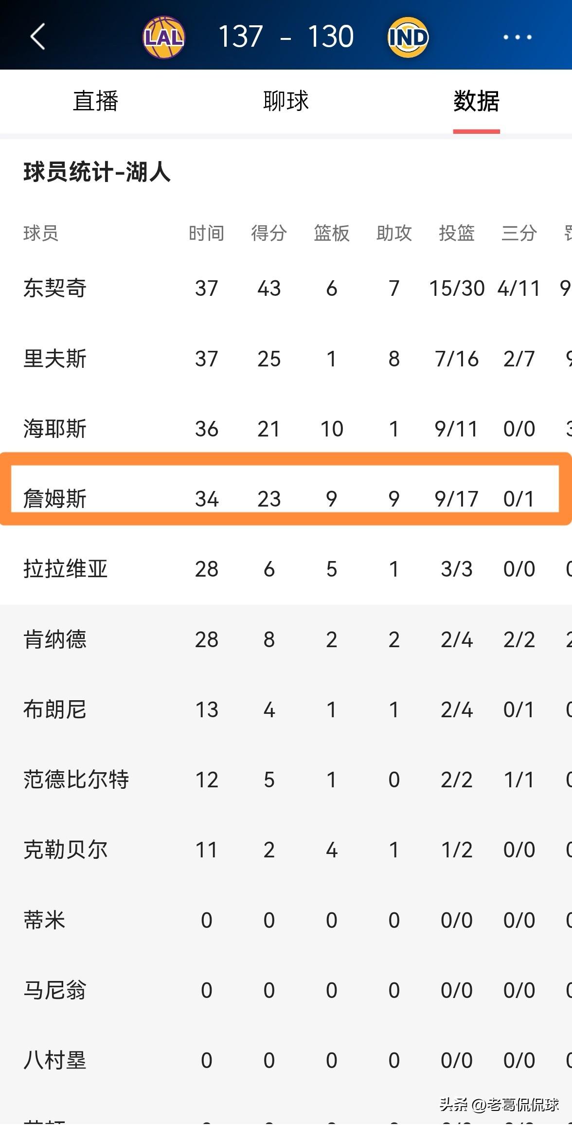 湖人巨星詹姆斯真是太讨厌刷数据了!在今天湖人客场以137:130战胜步行者的比赛中,詹姆斯再次打出了非常高效的表现,他距离砍下三双仅差1篮板和1助攻。说实话,本场比赛詹姆斯要想砍下三双简直易如反掌,但是詹姆斯天生就讨厌刷数据,所以詹姆斯为了球队的利益甘愿牺牲自己的数据。 全场比赛下来,詹姆斯首发出战34分钟,投篮17中9,其中三分球1中0、罚球5中5非常高效的砍下23分9篮板9助攻1抢断,他的场上正负值高达+24。 毫不客气的说,那些污蔑詹姆斯是数据刷子的人真是太让人失望了,他们完全是信口开河。