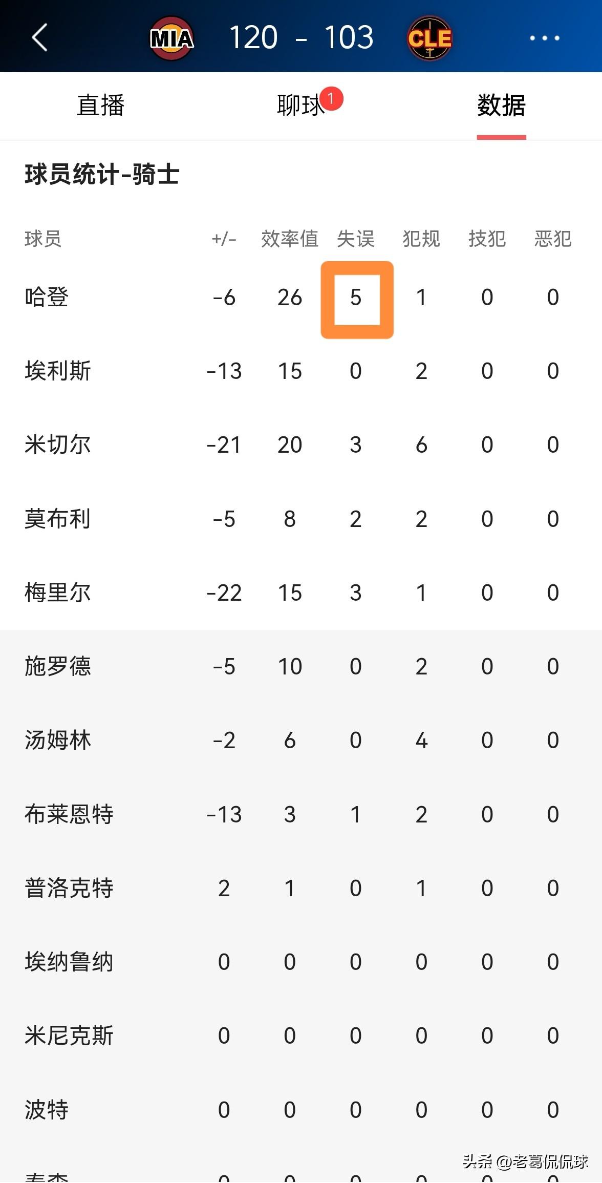 骑士巨星哈登真是失误太多了!在今天骑士主场以103:120惨败于热火的比赛中,哈登出现了多达5次的失误。 全场比赛下来,哈登首发出战42分钟,投篮10中4,其中三分球9中3、罚球7中7得到18分9篮板7助攻,不过有5次失误,他的场上正负值为-6。 说实话,本场比赛哈登的整体表现还是非常不错的,他在攻防两端都很卖力,只是哈登的失误太多了。