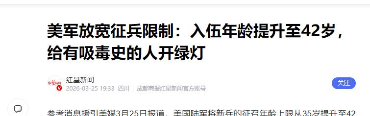 美国要打大仗了! 3月25日,据美国五角大楼发布的消息称,美国将在4月20日开始,正式将入伍的最高年龄从35岁提高到42岁,那些因为“毒品”而被定罪的人,也不再需要特殊许可就可以入伍了,多位专家表示,美国这是准备为实施战争动员做准备。 美国现在的军事胃口,真的很大。整个防御体系已经紧绷到了极点,最近的征兵新政和天价预算计划,直接撕开了美军最后的体面。这分明是在告诉全世界,所谓的全球霸权,已经进入了靠透支来硬撑的阶段。 五角大楼这次是真的豁出去了,入伍门槛直接降到了地板以下。入伍年龄上限竟然放宽到了四十二岁,甚至连以前绝对不碰的毒品犯罪记录,现在也能睁一只眼闭一只眼。这种“饥不择食”的筛选机制,正在让这支职业军队的素质走下坡路。 兵源荒的问题已经到了火烧眉毛的地步。美军这两年的人员缺口高达25%,现在的美国年轻人,大多因为身体太虚或者底子不干净被拒之门外。想在这一代人里找个合格的新兵,简直比登天还难。 年轻人不想当炮灰,精英阶层更是避之不及。军方实在没办法,只能把手伸向体力衰退的中年人和社会边缘群体。这种拿人头凑数的操作,其实就是用账面上的“满员”来掩盖战斗力的严重退化。 除了缺人,钱的问题更离谱。新提出的拨款申请高达一点五万亿美元,大部分都要砸进导弹防御系统。可美国现在的债台高筑大家都有目共睹,这么大一笔钱根本没有稳定的出处,纯粹是在悬崖边上走钢丝。 更气人的是,军费都被糟蹋了。去年竟然有九千万美元花在了海鲜大餐和奢侈家具上,五角大楼甚至还买了一架十万美元的钢琴。这种内部管理的混乱说明,大量的血汗钱根本没变成战斗力,而是被挥霍掉了。 美军内部还有个怪圈,年底突击花钱。为了保住明年的预算额度,他们宁可把钱听响放炮也要花完。这种官僚逻辑让纳税人的钱养肥了一个臃肿的体系,也让财政崩溃的风险越来越大。 现在的美国是三头着火:北约东翼要防着俄罗斯,中东每天要烧掉九亿美元,印太地区还得砸重金部署。这种多线开花的局面,把美军折腾得精疲力竭,完全是在疲于奔命。 长期的高强度压榨已经掏空了美军的底子。现在搞这种“放宽标准”的征兵,就是为了填补战线拉得太长留下的坑。这也恰恰证明,真要面对大规模冲突,美军其实已经心有余而力不足了。 这种事以前也干过,结果很惨。二零零六年美军就招过“高龄兵”,结果导致军队犯罪率飙升,一大堆心理出问题的士兵退伍后成了社会的巨大包袱,后患无穷。 现在的局势比二十年前更复杂。这次强行凑齐的员额,是一群“大叔兵”和“问题兵”组成的脆弱武装。这种做法正在亲手毁掉美军苦心经营几十年的专业基石。 规矩可以随便改,但战斗力是装不出来的。靠透支未来换来的武装规模,注定是个一戳就破的肥皂泡。 大家都在盯着看,这道金玉其外、败絮其中的防线,到底还能硬撑多久。这种无奈的选择,本身就说明霸权的黄昏已经到了。 信息来源:《美军放宽征兵限制:入伍年龄提升至42岁,给有吸毒史的人开绿灯》,红星新闻,2026年3月25日。