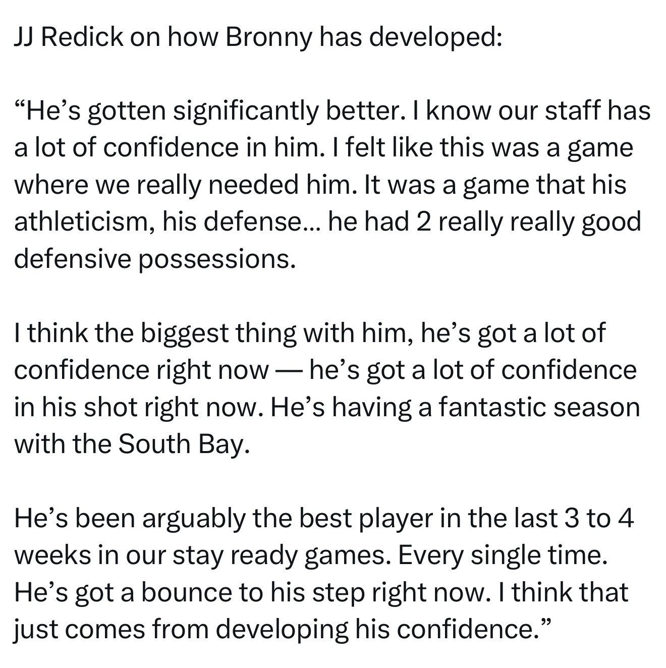 我认为他现在最大的特点是充满自信,尤其是在投篮方面信心十足。他在南湾湖人队度过了非常出色的一个赛季。