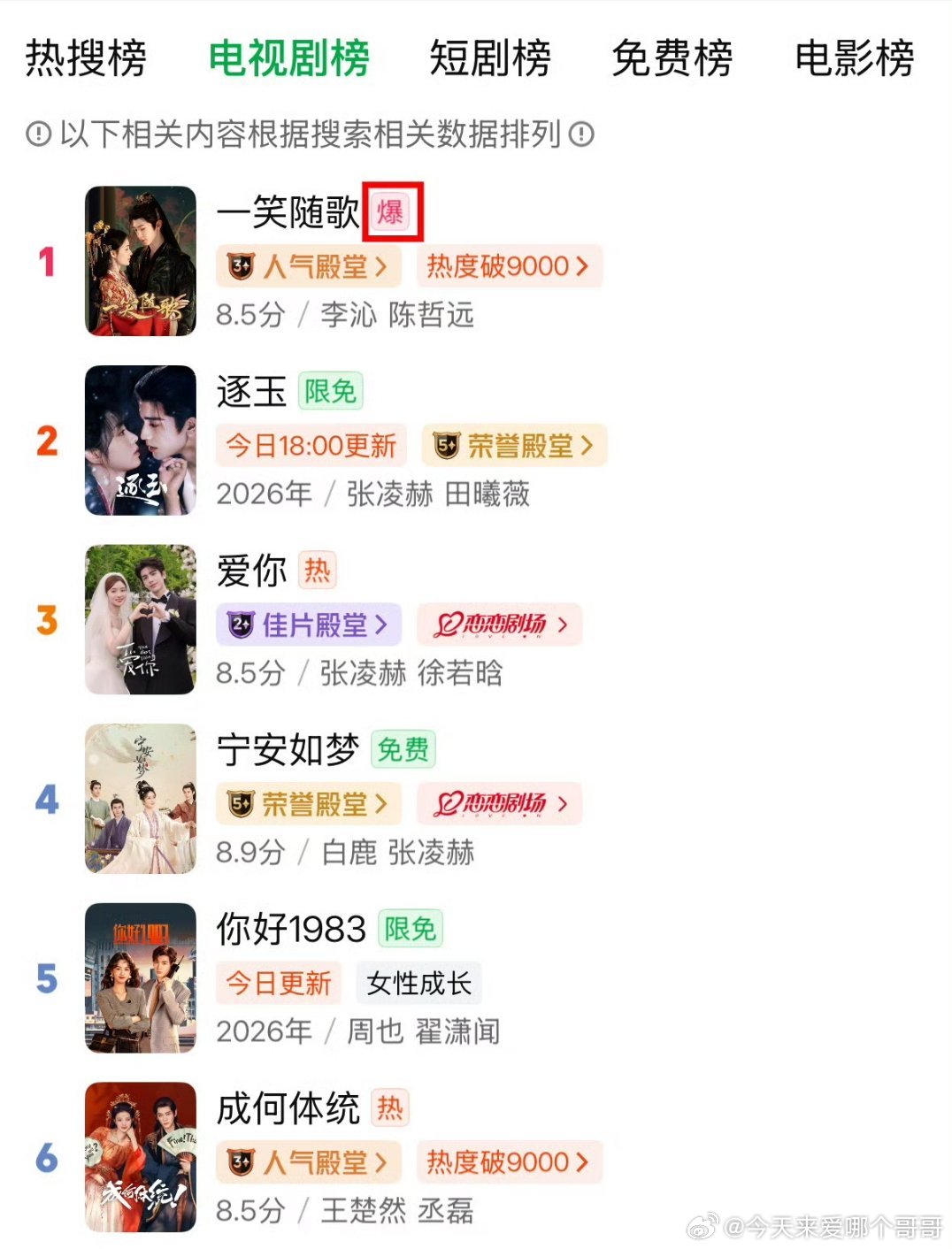 《一笑随歌》爱奇艺热搜榜和电视剧榜超过《逐玉》登顶了