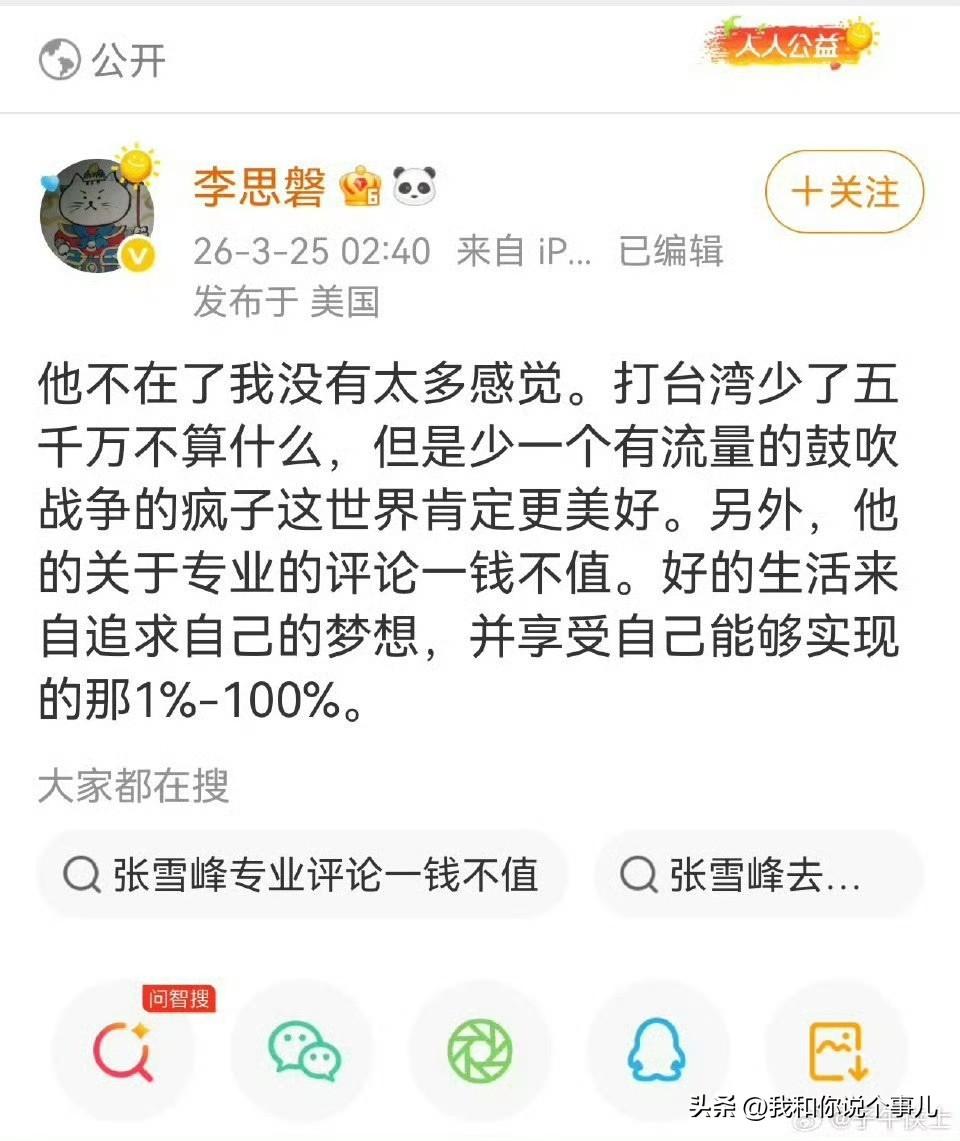 有的人活着,已经死了;有的人死了,还被某些“网红”扒出来啃最后一口流量。一句“东北网红数量减一”,一句“鼓吹战争的疯子”,把冷血和无知写得明明白白。 靠消费逝者博眼球,吃相难看至极,这种人也配谈“尊重”二字? 网友还提醒“牢牢记住,死者为大”, 他却回怼“凭什么?”,后续更发表“死者又不是我爹,凭什么为大”等冷血言论, 博主“李思磐”发文称张雪峰“不在了我没有太多感觉”,污蔑其为“鼓吹战争的疯子”,还贬低其专业评论“一钱不值”,同时夹带涉台不当言论。 这波操作真的刷新了底线。一边喊着“死者又不是我爹”拒绝基本的尊重,一边把对国家统一的渴望恶意歪曲成“鼓吹战争”。 张雪峰老师即便离世,功过不论,但生者对逝者最起码的悲悯,不该被这样冷血践踏。拿着别人的悲痛博眼球,夹带私货污名化,这种人连做人的基本分寸都没有,何谈做公众人物?