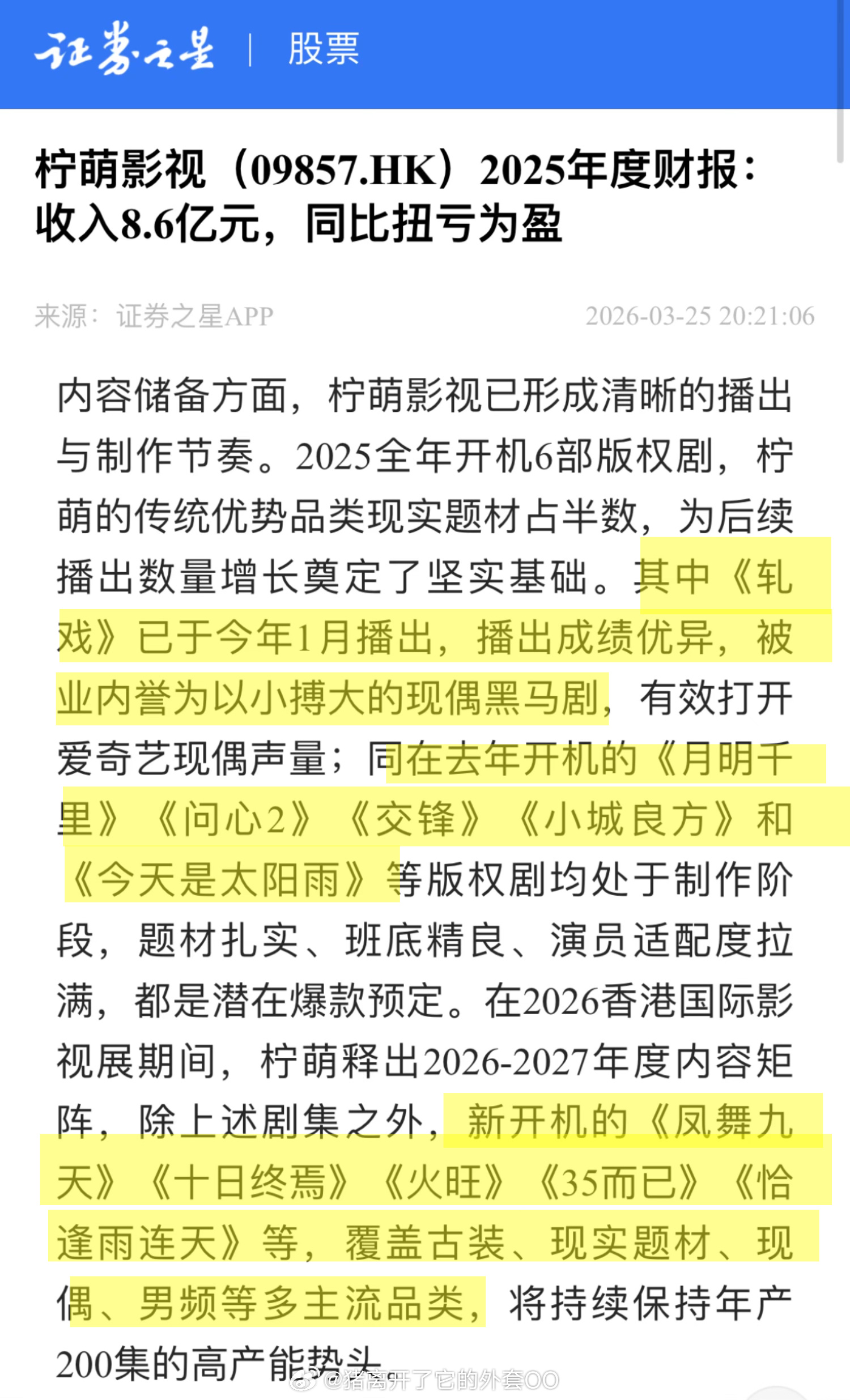 柠萌影视2025年开机量最高 柠萌2025年财报盈利2025年柠萌播出的剧成绩都不错!2025年开机6部剧各种类型不重复,成为全行业开机量最多的公司,回报率又快又高。在这样的高产量下,依然实现全业务盈利,收入8.6亿,比2024增长31.3%。今年已播《轧戏》成黑马,后续待播5部都是值得看好的,还有《十日终焉》《恰逢雨连天》《火旺》等超级大IP,期待都能码到好阵容!!