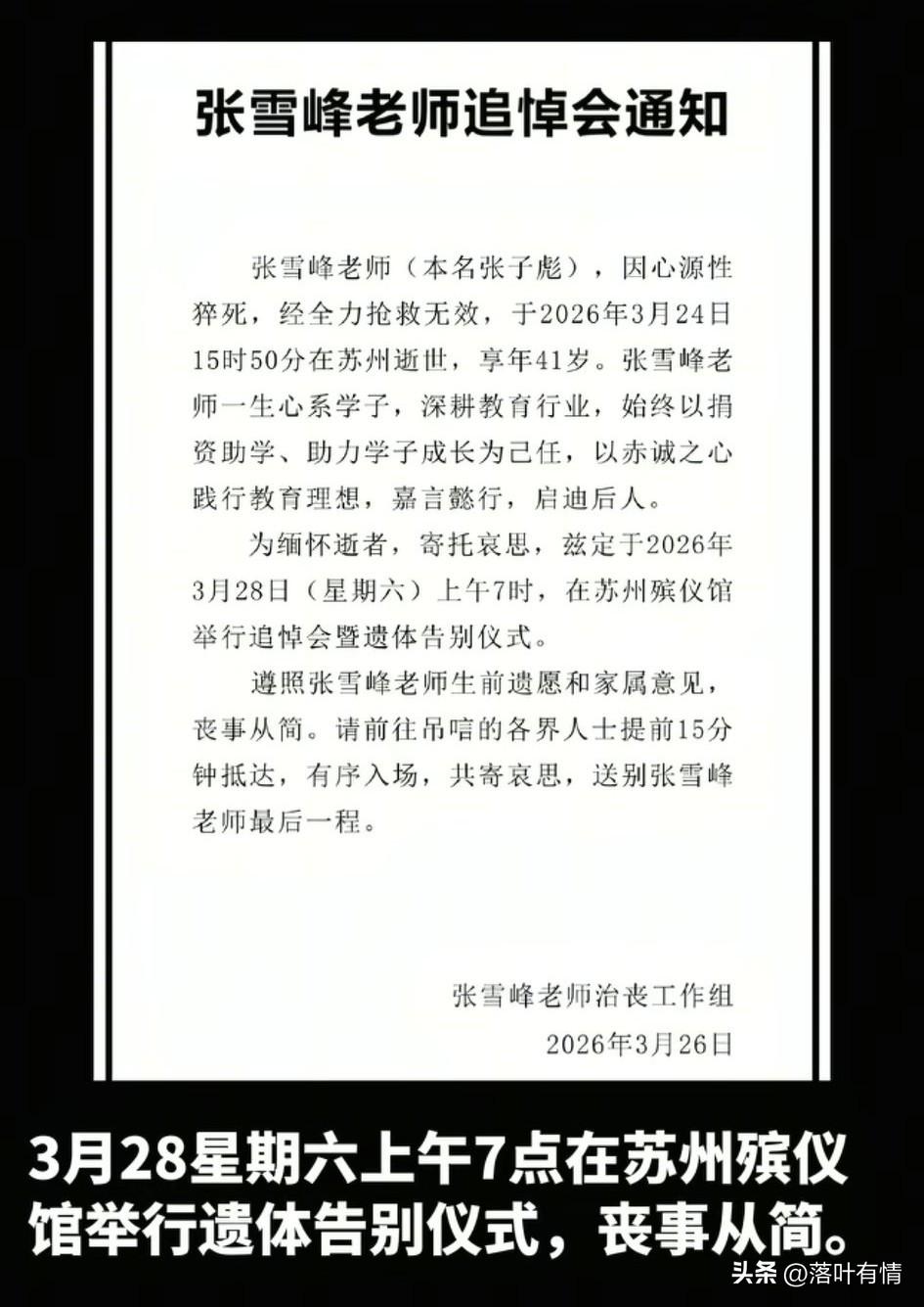 考研辅导的张雪峰, 他的离世引起了两个热议方向, 一个是对他生前的总结, 另一个则是讨论度最高的, 那就是什么是心源性猝死, 年仅41岁的张雪峰给自己的生命交出了答卷,凭借考研辅导, 他赚了上千万的身价, 如今在他最喜欢的工作岗位上, 轰然倒下, 这绝不仅仅是意外, 而是他多年熬夜直播造成的结果, 早年间就有粉丝提醒他嘴唇发紫, 心脏可能不太好, 他在直播中直接回怼粉丝, 自己可是跑过半马拉松的人, 说自己心脏不好,怎么可能? 结果就发生了心源性猝死, 如今知名媒体都在讨论心源性猝死, 当时有人建议晚上睡觉不要超过10点, 如果熬夜了,第二天不要激烈运动, 否则你就可能像他一样, 张雪峰的离世, 不仅引起了考研辅导市场的动荡, 而且还让人们关注到了心源性猝死, 大家觉得年轻人是不是应该不要那么熬夜了? 张雪峰简历 张雪峰停播 张雪峰账号异常 张雪峰怒怼评委 张雪峰直播争议 张雪峰猝死 张雪峰婚变