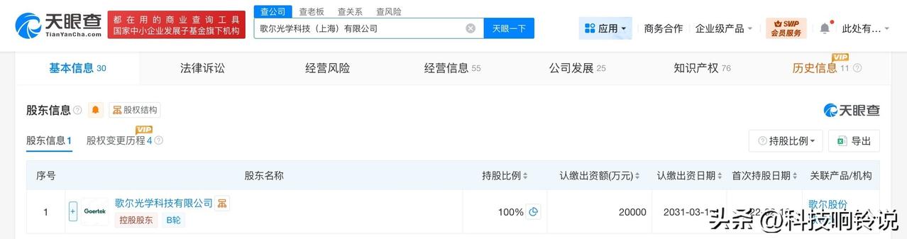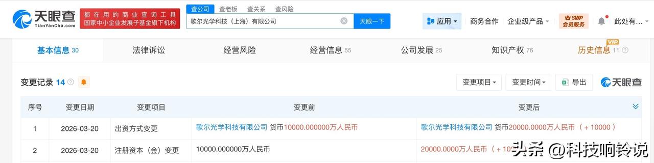 【歌尔光学科技上海公司增资至2亿 增幅100%】 天眼查工商信息显示,近日,歌尔光学科技(上海)有限公司发生工商变更,注册资本由1亿人民币增至2亿人民币,增幅100%。 该公司成立于2022年2月,法定代表人为饶轶,经营范围包括光学仪器制造、虚拟现实设备制造、智能车载设备制造、可穿戴智能设备制造等。股东信息显示,该公司由歌尔光学科技有限公司全资持股。 天眼查信息: