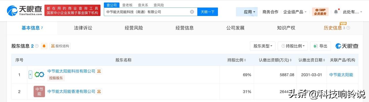 【中节能太阳能在南通成立新科技公司 注册资本8532万】 天眼查工商信息显示,近日,中节能太阳能科技(南通)有限公司成立,法定代表人为王振国,注册资本8532万人民币,经营范围包括太阳能发电技术服务、光伏设备及元器件销售、光伏发电设备租赁等。股东信息显示,该公司由中节能太阳能科技有限公司、中节能太阳能香港有限公司共同持股。 天眼查信息: