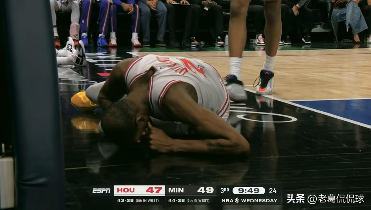 火箭当家球星杜兰特真是让人心疼不已!在今天火箭客场挑战森林狼的焦点战中,当时比赛进行到了第三节的九分多钟,杜兰特在一次进攻回合中持球强杀篮下,最后被森林狼中锋戈贝尔一巴掌打到了嘴上,这下可把杜兰特给疼坏了。只见杜兰特躺在地上用手捂着自己的嘴巴看起来特别的痛苦,让人看着心疼不已。