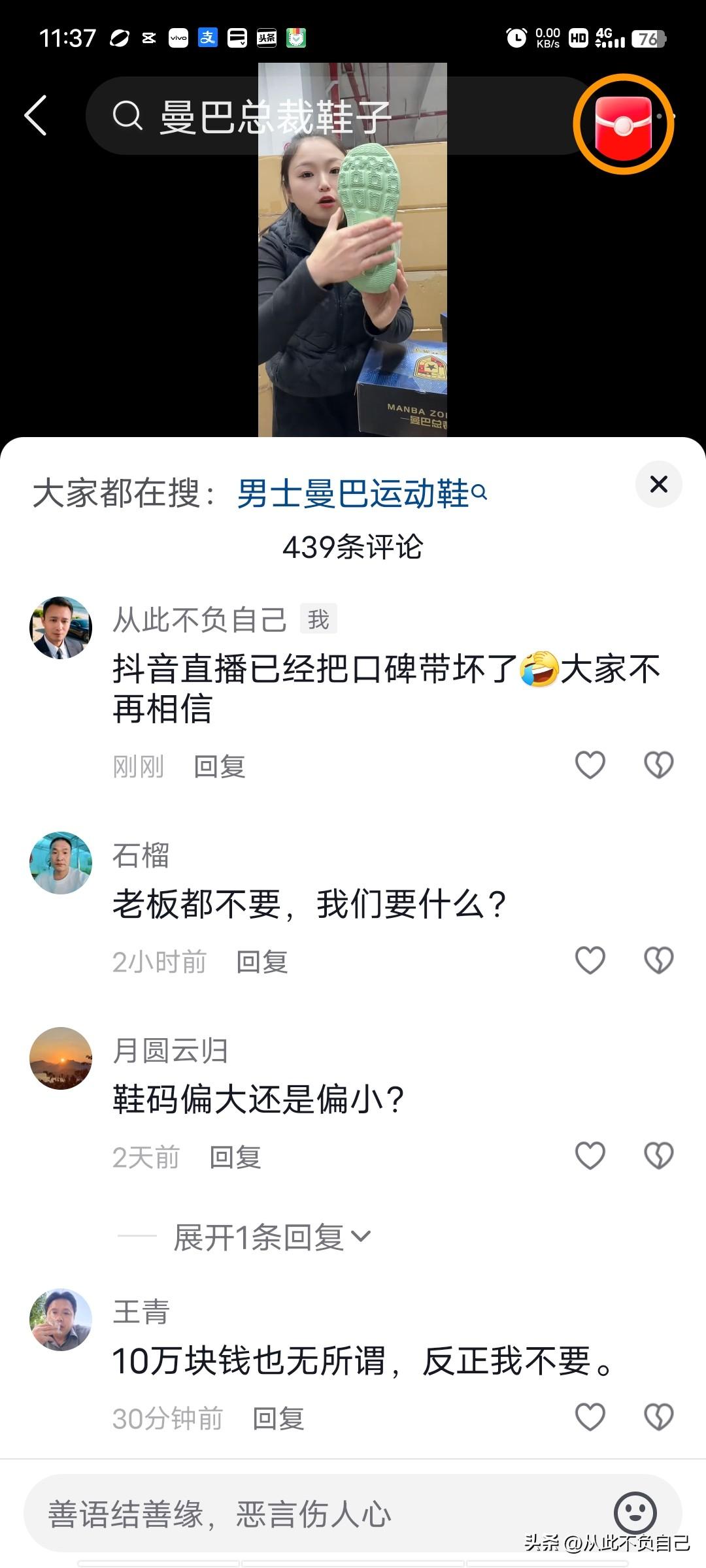 2888元的鞋48元都没人买!这是来自抖音直播带货的视频,主播在视频里唾沫横飞的介绍着手里的商品,说是老美不要的外贸鞋,原价2888元,现在只需要48就可以买到。 这么好的事听着就让人怦然心动,主播展示的商品看起来确实不错,但奇怪的是评论区全是一色的讽刺挖苦,反正很少有人下单! 现在的消费者都这么精明了吗?主要的经验教训接受太多了,大家害怕了!笔者也曾经买过多次直播的商品,看起来真的又便宜又好,但收到货后一看,没有一次让自己满意的!都是货不对板,以次充好! 现在,大家都明白了,一分钱一分货,便宜没好货,这是永远的真理!所以,越来越多人不再喜欢直播商品,太假了,平台的纵容让这样的卖货方式把口碑变坏了!