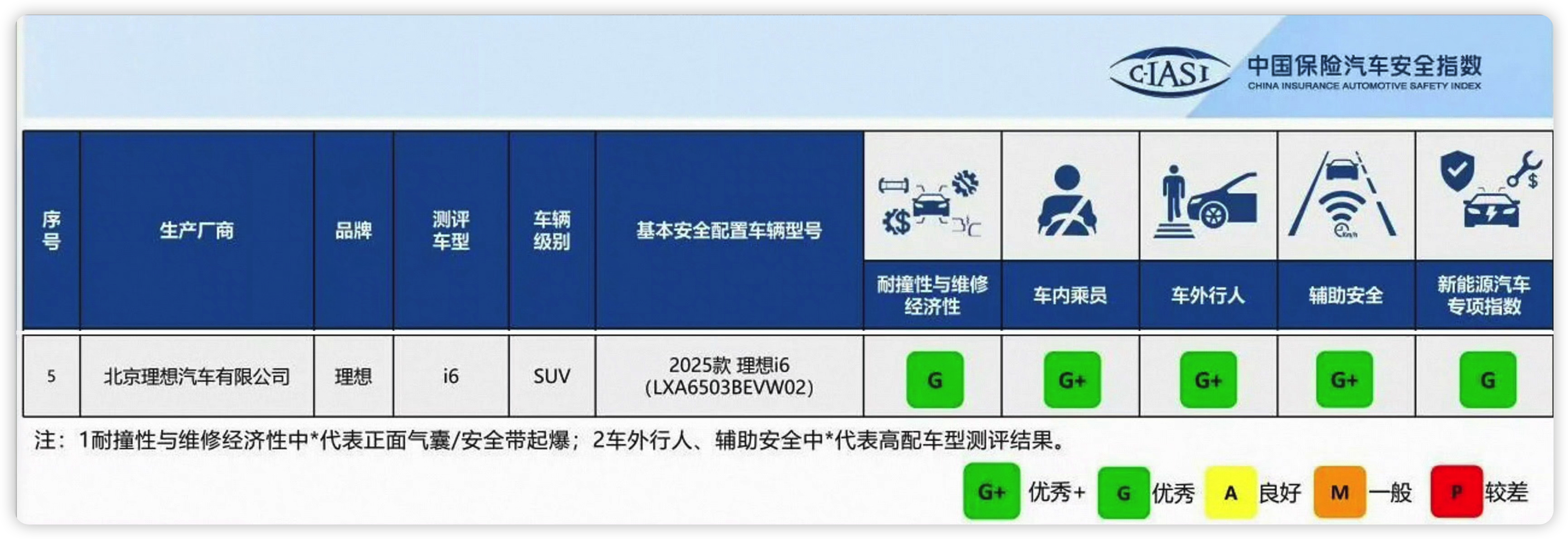 3月26日,中国保险汽车安全指数测评结果公布:理想i6荣获“5G”全优评级,与理想i8并列中大型纯电市场安全评级最高车型。理想全系获中保研全优安全评级