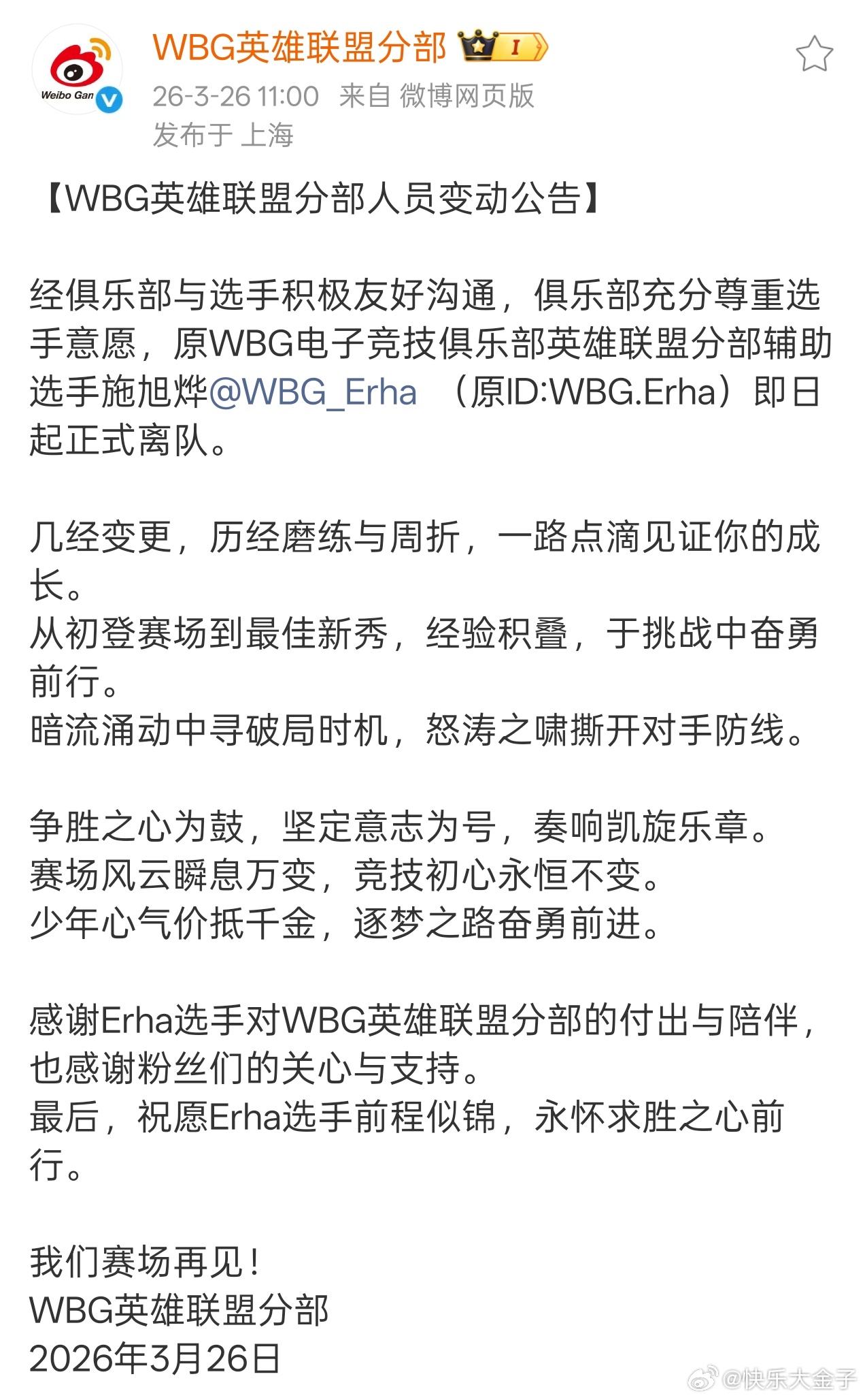 WBG官宣Erha离队 好快的官宣!WBG宣布Erha离队,夯大哥要回来跟Elk搭档啦。