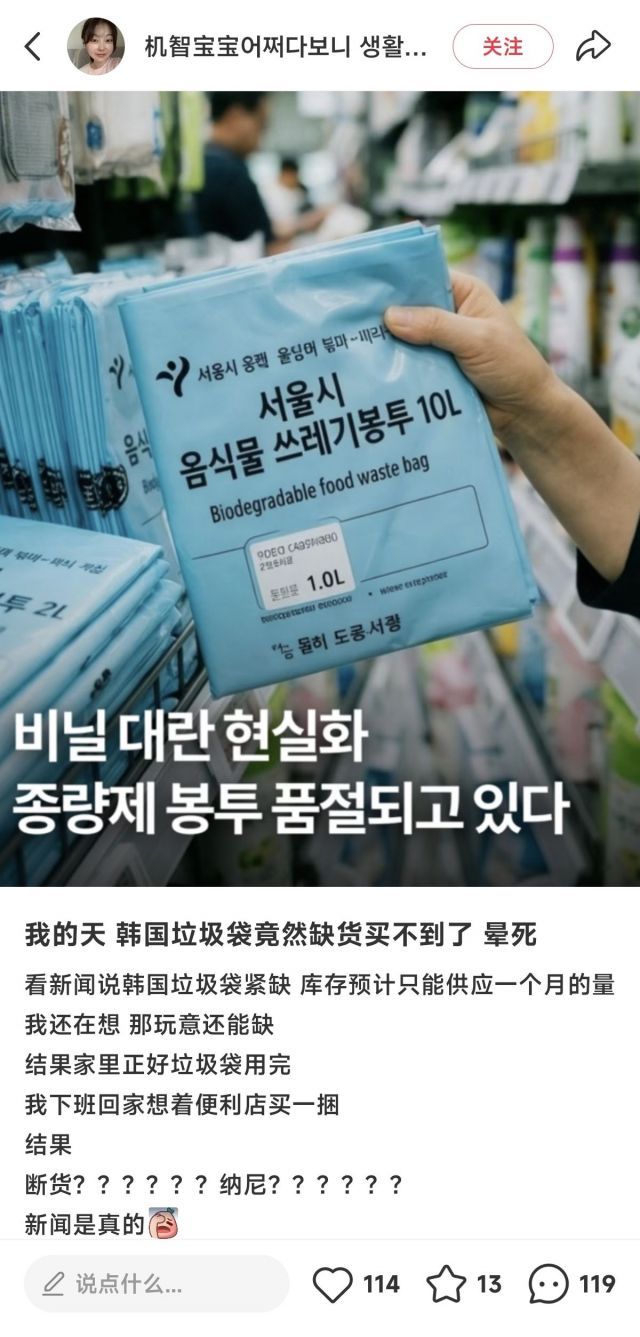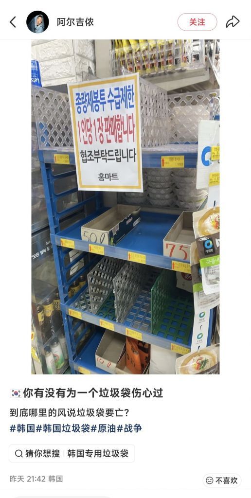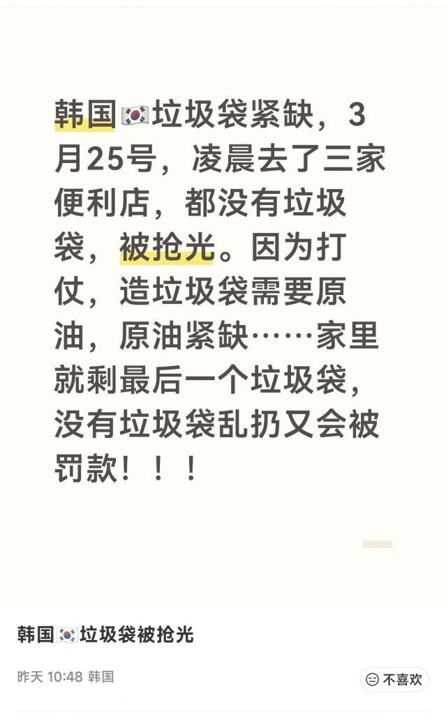韩国开始抢购垃圾袋了,看来塑料袋的原料--石脑油极度紧缺,不像原油那样还有100多天的战略储备