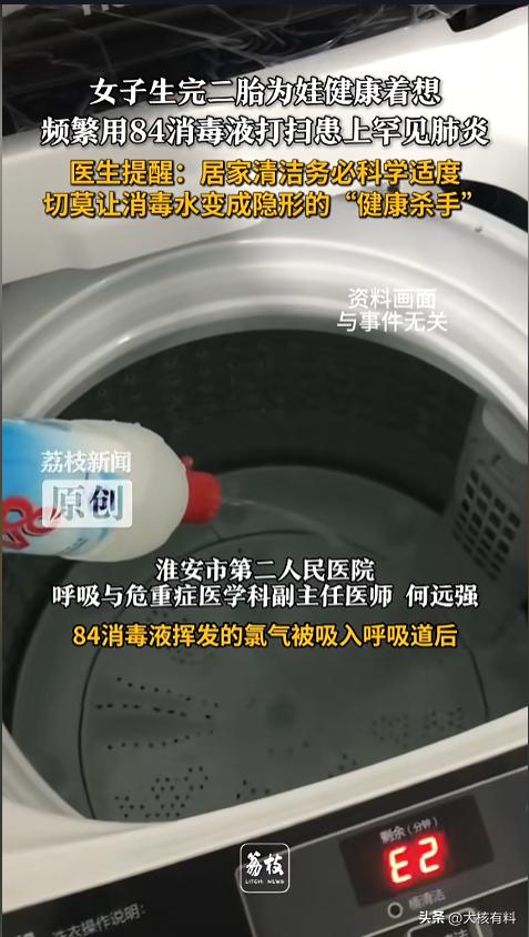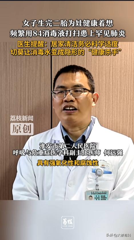 “万万没想到!”一个月前,江苏淮安,一女子因呼吸困难到医院就诊,医生诊断却是患上了一种罕见病——急性嗜酸性粒细胞肺炎,元凶竟然是常用的84消毒液!原来,女子频繁使用84进行卫生清洁,挥发的气体变成了健康杀手。网友:过犹不及! 据媒体3月19日报道,张女士对自己的居家卫生要求极高,甚至像“洁癖”一样,每天都得把家里打扫的干干净净。不久前,她又生了二胎,为了宝宝的健康,她对卫生的要求就更高了。 每天,她都要花上大把的时间,用84消毒液拖地,擦拭家具,恨不得让家里一点病菌都没有。这样的日子持续了一段时间,一个月前,张女士感觉自己呼吸困难,胸闷气短,于是到医院进行了检查。 诊断说,张女士患上了急性嗜酸性粒细胞肺炎,这是一种罕见病。通过对张女士的日常询问,也确认了,致病原因就是她平时用84消毒液太频繁了。 医生解释,84消毒液的主要成分是次氯酸钠,消毒主要就是靠它的强氧化性和腐蚀性。它溶解时会挥发出一些氯气,被人吸入后就会刺激气管,时间长了可能造成化学性支气管炎。 凡事过犹不及,居家卫生也是这样。家庭毕竟不是重症监护室,没有必要去追求什么无菌环境,只要满足干净卫生就行了。消毒水并不是完全无害的,过量的使用它,反而会导致一些损伤,一定要掌控好这个合适的度。 信息来源:《宝妈每天用84消毒患上罕见病 医生回应宝妈每天用84消毒患罕见病 医生提醒:居家清洁务必科学适度 切莫让