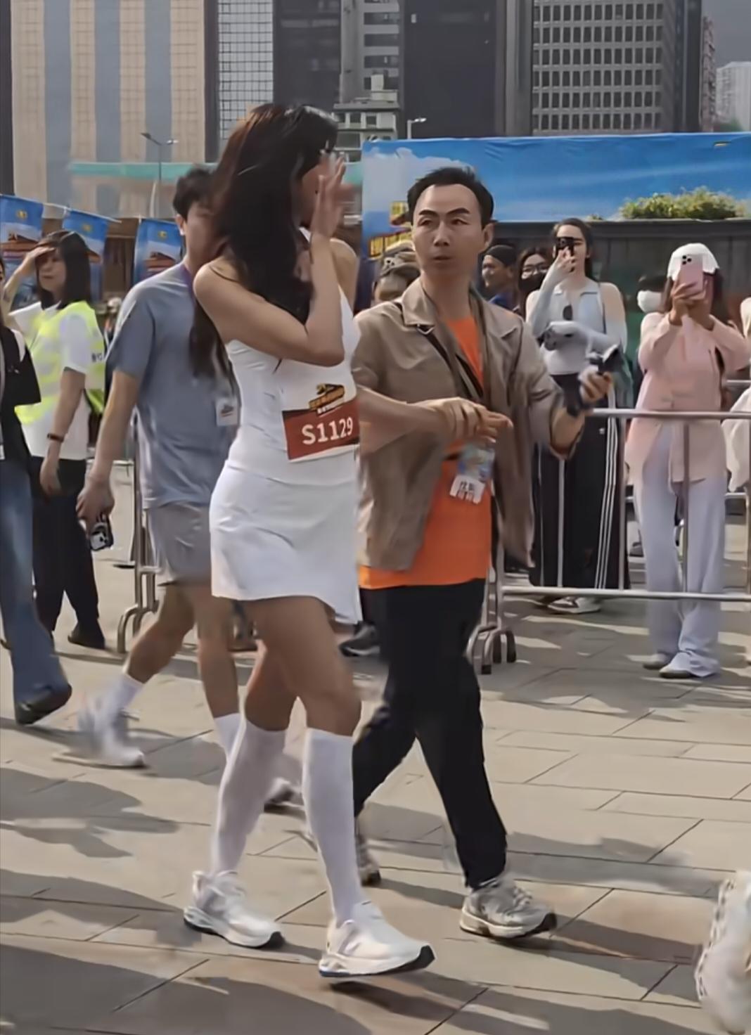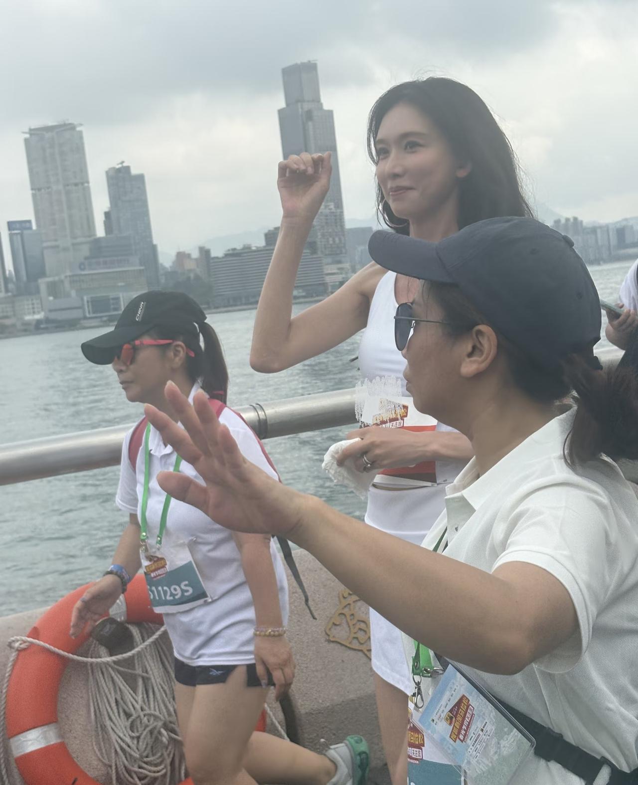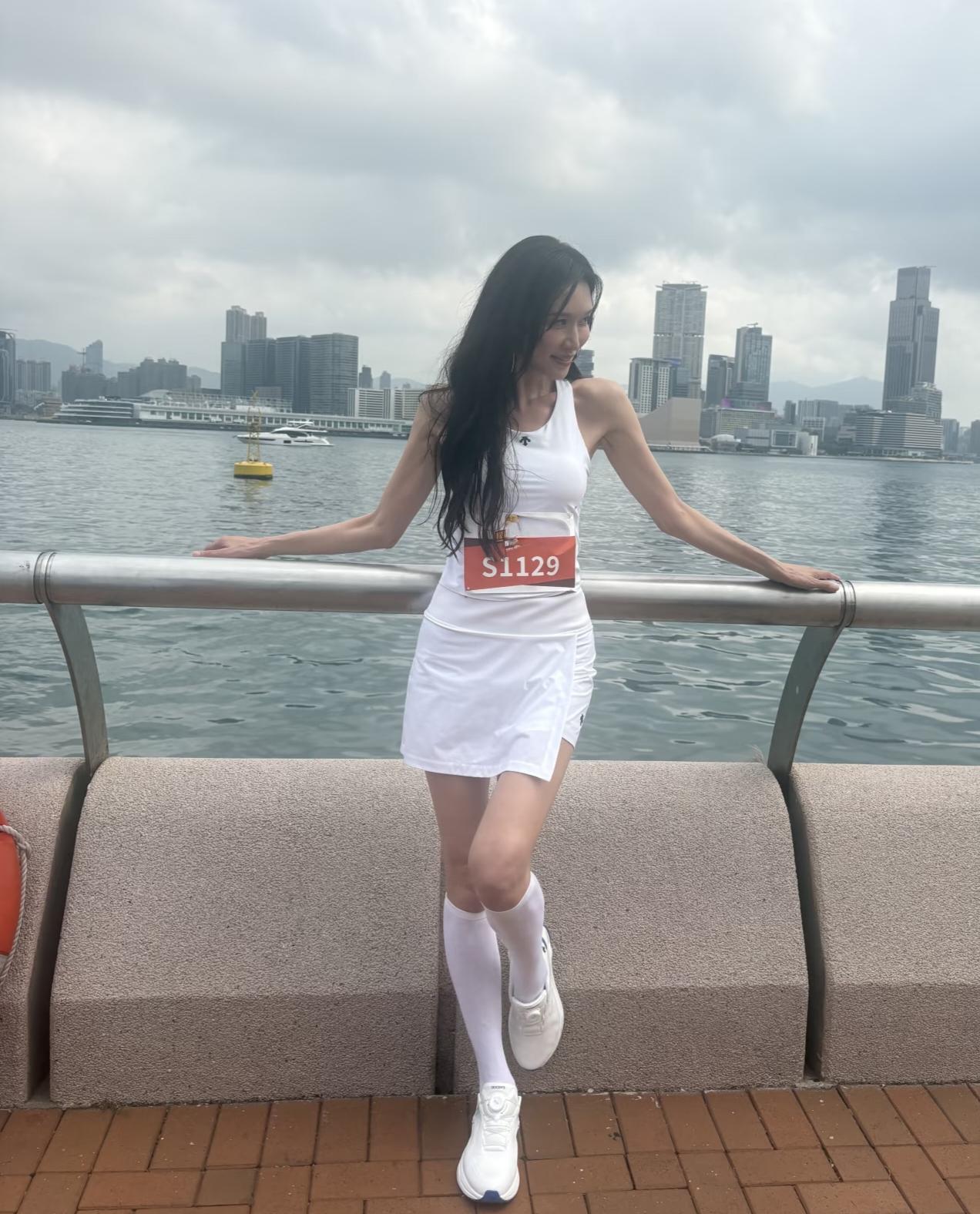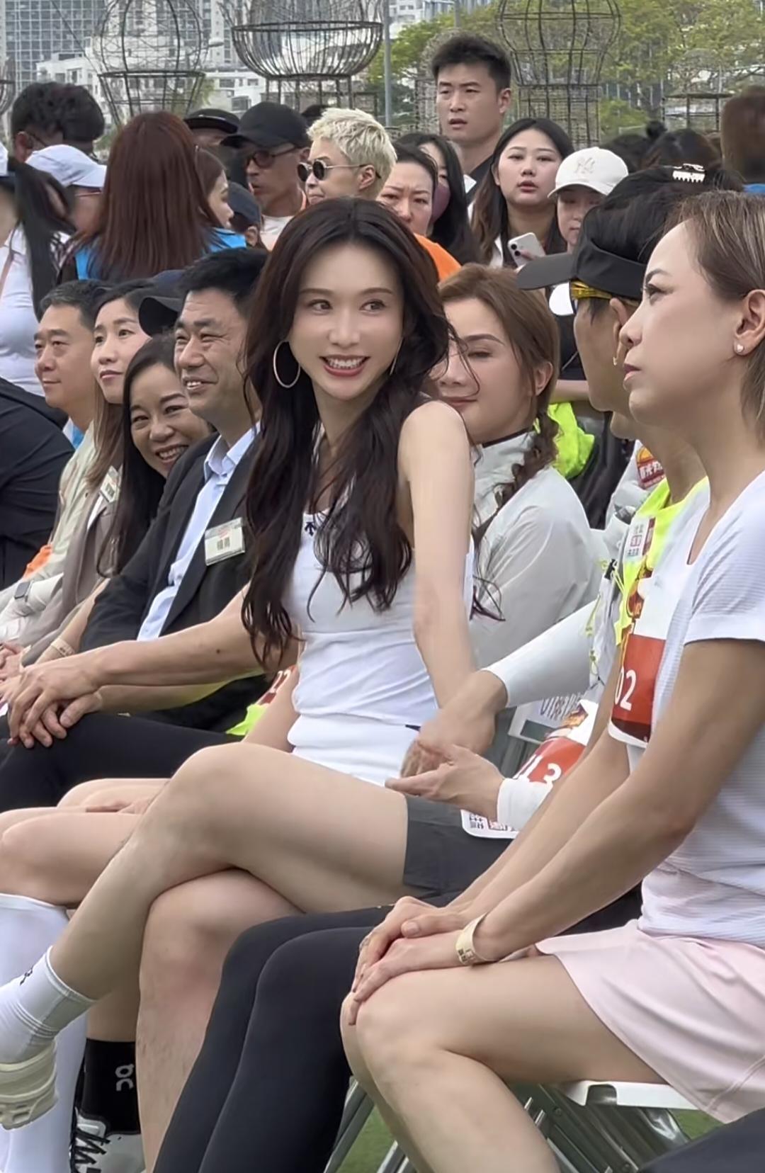 3月26日,52岁林志玲现身香港参加马拉松活动,她穿着一身白色运动服,露出大腿,