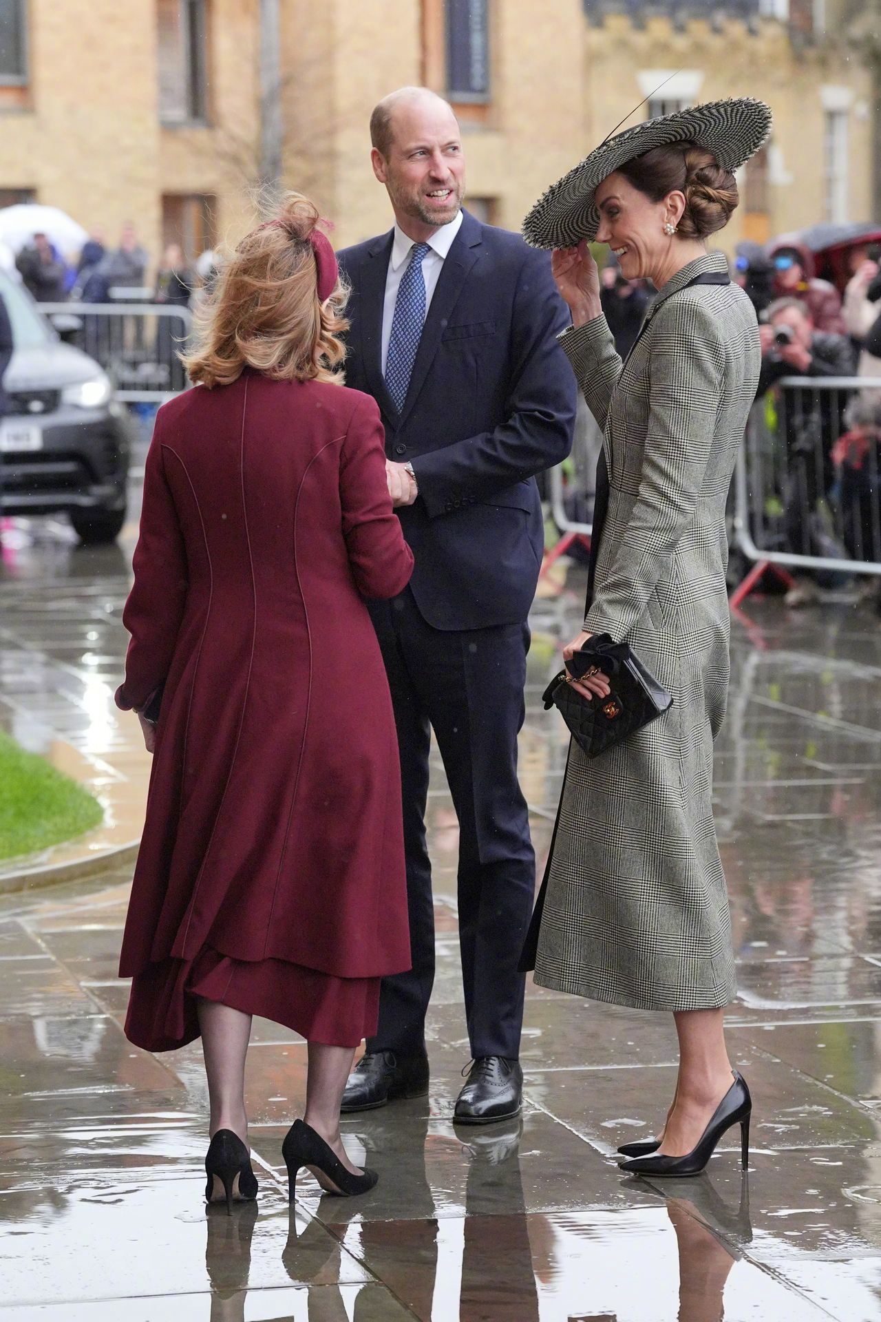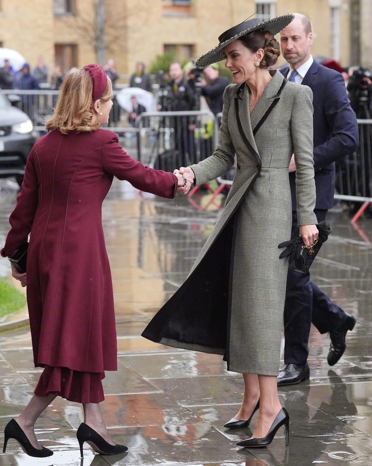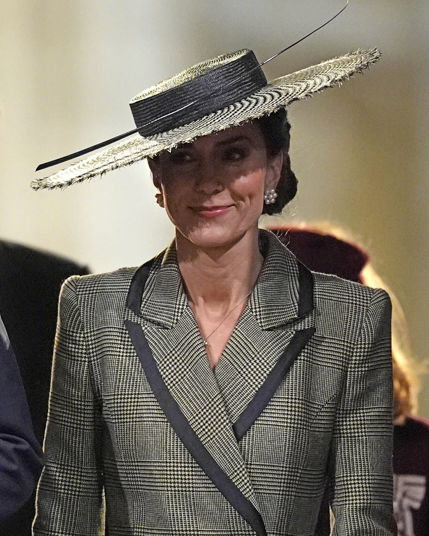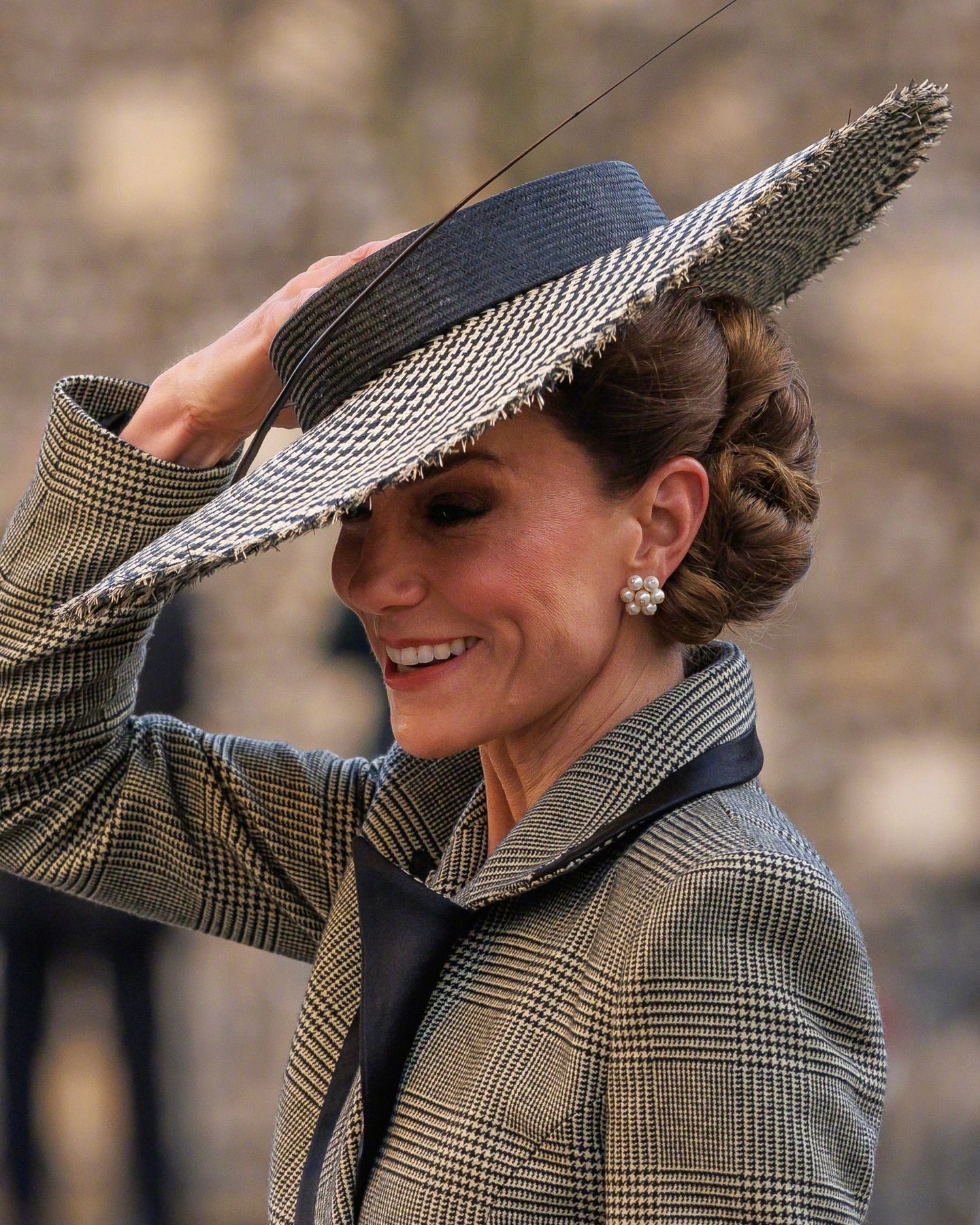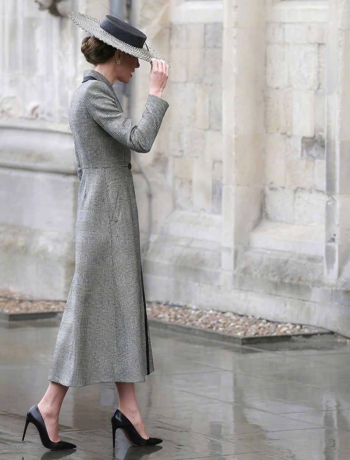 当地时间 3 月 25 日,威廉王子和凯特·米德尔顿在坎特伯雷大教堂出席了莎拉·穆拉利女爵士就任坎特伯雷第106任大主教的加冕典礼。凯特王妃身穿 Suzannah London 的威尔士格纹格纹羊绒大衣,搭配 Juliette Botterill Millinery 的千鸟格草帽,脚穿Ralph Lauren 的黑色尖头高跟鞋。大衣上的格纹印花巧妙地呼应了威廉的皇室身份。盘发做得好精致。米拉服饰解析