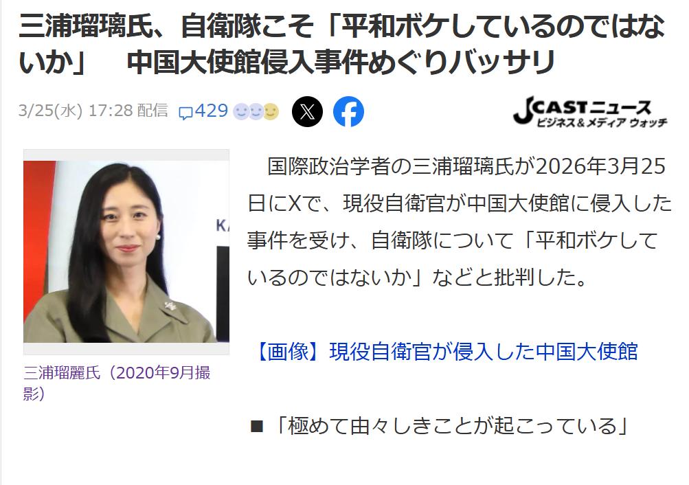 日学者:对自卫队军官”扭曲心理“表示愤慨 2026年3月25日,日本国际政治学家三浦瑠璃发文,对一名现役自卫队军官闯入中国大使馆的事件评论称:这一事件归咎于自卫队的“模糊和平”政策, 内阁官房长官木原稔于3月25日上午的新闻发布会上回应记者提问时说:“我知道一名现任自卫队军官于3月24日闯入东京中国大使馆,被警视厅以涉嫌非法侵入建筑物逮捕。” 木原说:“一名本应遵守法律的自卫队官员因涉嫌非法侵入建筑被逮捕,实在令人遗憾。” 中方对这一事件表达了抗议。 嫌疑人村田晃大毕业于某所综合大学(非国防学院),并于1月26日完成陆上自卫队军官候补学校的培训。被分配到宫崎县海老驻地。 三浦瑠璃于25日在X上提到了一篇来自《日经报》的文章。 该报道称这名激进的自卫队军官表示,如果他的意见不被采纳,可能会考虑自杀。 三浦瑠璃说:“一名自卫队军官不仅闯入中国大使馆,还表示他准备'自决'”,并指出“发生的事件极其严重。” 三浦瑠璃提出了一个问题:“为什么一位自卫队军官会随意行事,带着如此扭曲的正义感?” 三浦瑠璃严厉批评道:“自卫队处在假和平的痴呆中。 这一事件题“应由军事法庭严厉处罚,视为违反军纪,而非与平民相同的处罚标准”,但由于日本法律体系的不足,将被视为与平民同等标准处理。” 三浦瑠璃还评论道:“多年来没有将自卫队视为军事单位,讽刺的是,作为士兵,缺乏严格的军人意识、纪律或惩罚。” 而日本网络上却出现“令人愤慨的言论,比如:“无法确保中国大使馆的安全”。 在随后的帖子中,三浦瑠璃还表示:“称无法保障中国大使馆安全令人愤慨,东京警察厅应当认真对待此事。” 三浦瑠璃还正告政府:“我希望你们彻底调查发生此类事件的原因,尽管此事被认为是独立性事件,但必须向国会报告自卫队内部管理的现状。”