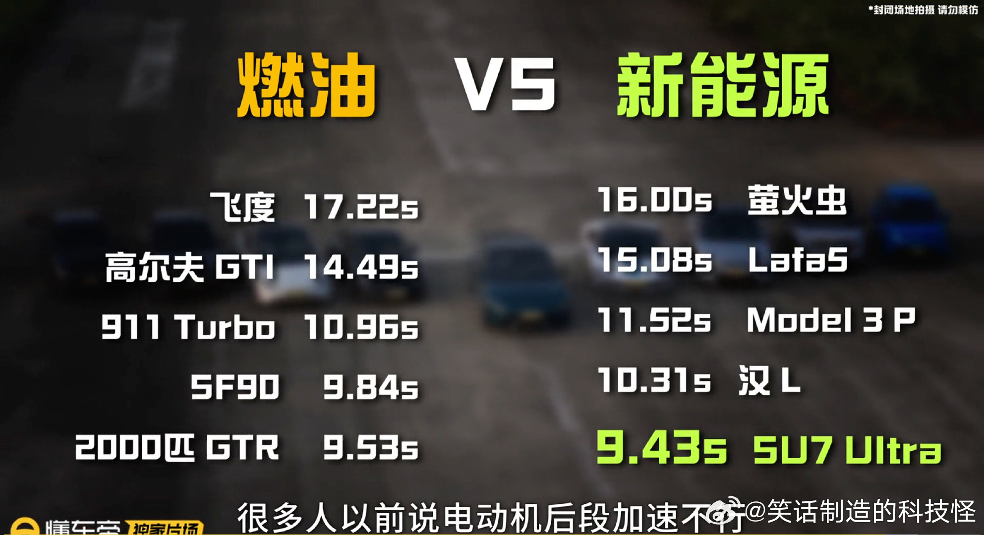 油车与电车的直线加速之争,不如用对比见分晓。极速拍档打造硬核油电竞速对决,给出了明确答案:100 匹组别中,蔚来萤火虫以 16.00s 的加速成绩,战胜原厂本田飞度的 17.22s;高性能阵营里,小米 SU7 Ultra 跑出 9.43s 的全场最快成绩,甚至超越 2000 匹改装 GTR,不仅印证顶尖电动车的加速实力远超传统燃油车标杆,更推翻了电动车后端加速乏力的谣言。值得注意的是,本次的燃油车均为纯原厂状态,而燃油车的改装潜力极大 —— 高尔夫 GTI 可刷程序、改涡轮提动力,911 Turbo 能升级硬件突破性能,2000 匹 GTR 也只是改装案例之一,远非燃油车改装的极限。简言之,原厂状态下电动车的加速天花板更高,而燃油车凭借无边界的改装潜力,在改装文化中依旧占据不可替代的地位。在新能源车型加速性能持续突破、甚至同价位就能碾压燃油车的当下,燃油车依然有不可替代的价值,核心价值并非单纯的直线加速性能,而是体验独特性、文化属性、场景适配性。电车凭加速实力刷新认知,油车靠改装潜力留住热爱,想了解更多油电加速对决的精彩内容,上懂车帝搜油电对决一探究竟。油车VS电车到底谁快 懂车帝独家片场(