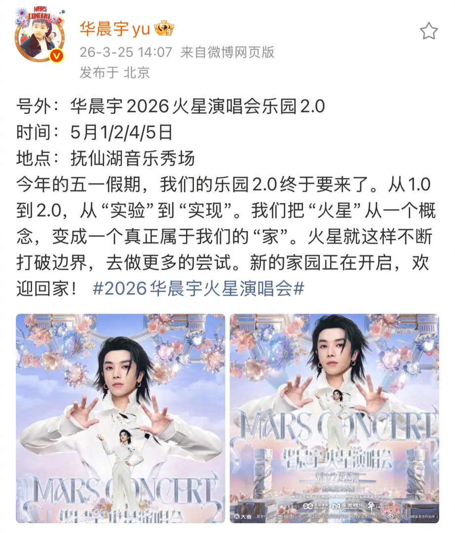 华晨宇的格局 华晨宇堪称偶像典范,始终坚守正能量初心。火星乐园演唱会2.0暖心官宣,以实际行动助力抚仙湖生态保护,用热爱扛起责任,格局与担当令人敬佩。