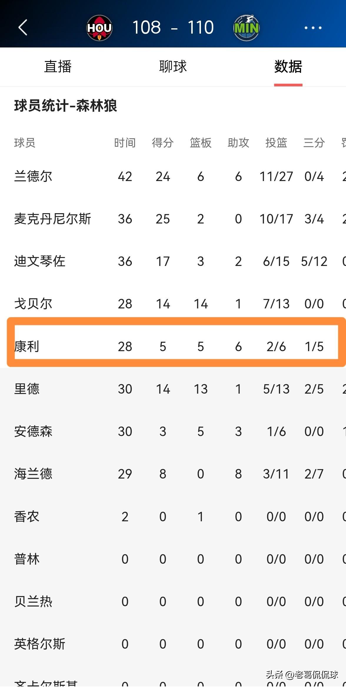 森林狼老将康利真是不负众望!在今天森林狼主场以110:108击败火箭的比赛中,老将康利被主帅芬奇提上了首发,康利在首发出战的28分钟里,投篮6中2,其中三分球5中1得到5分5篮板6助攻1抢断1盖帽,他的场上正负值为+2。 实事求是的说,以康利在本场比赛中的表现来看,他确实没有辜负主帅芬奇的期望,康利将球队的进攻梳理的井井有条。