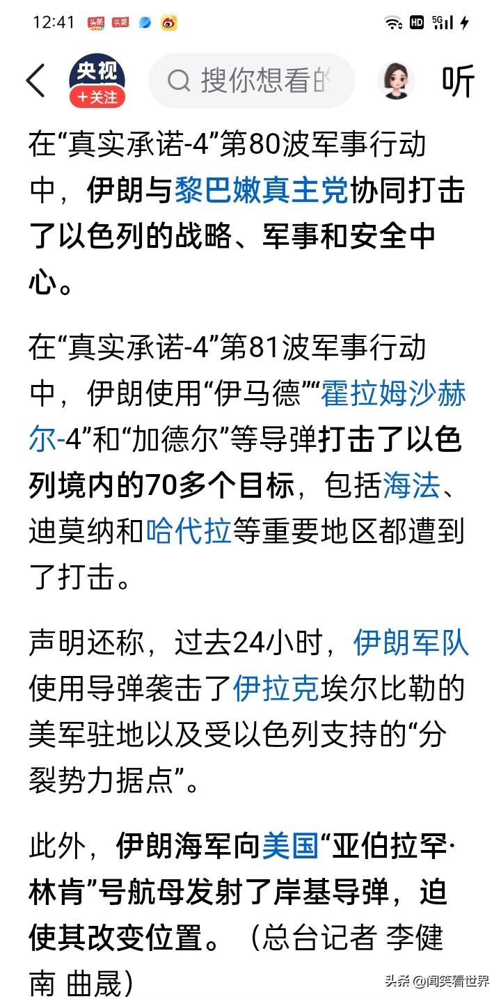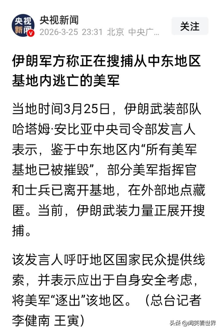 美军在逃,伊朗在追,美国的脸算是丢尽了…… 根据央视新闻的报道,当地时间25日,伊朗武装部队哈塔姆·安比亚中央司令部发言人称,在中东地区内“所有美军基地已被摧毁”后,部分美军指挥官和士兵已离开基地,并藏匿于外部地点,目前,伊朗武装部队正在展开追捕行动。伊朗军方发言人还呼吁中东国家民众积极提供美军的线索。 此外,伊朗军方还在声明中称,伊朗海军向美国“亚伯拉罕·林肯”号航母发射了岸基导弹,迫使其不得不“改变”位置。 根据伊朗军方的战报,美军在中东地区似乎已处于“逃亡”状态。果真如此的话,美国这个世界第一军事强国的脸算是丢尽了! 不得不说,在这个世界上,有的人拳头硬,有的人嘴硬……