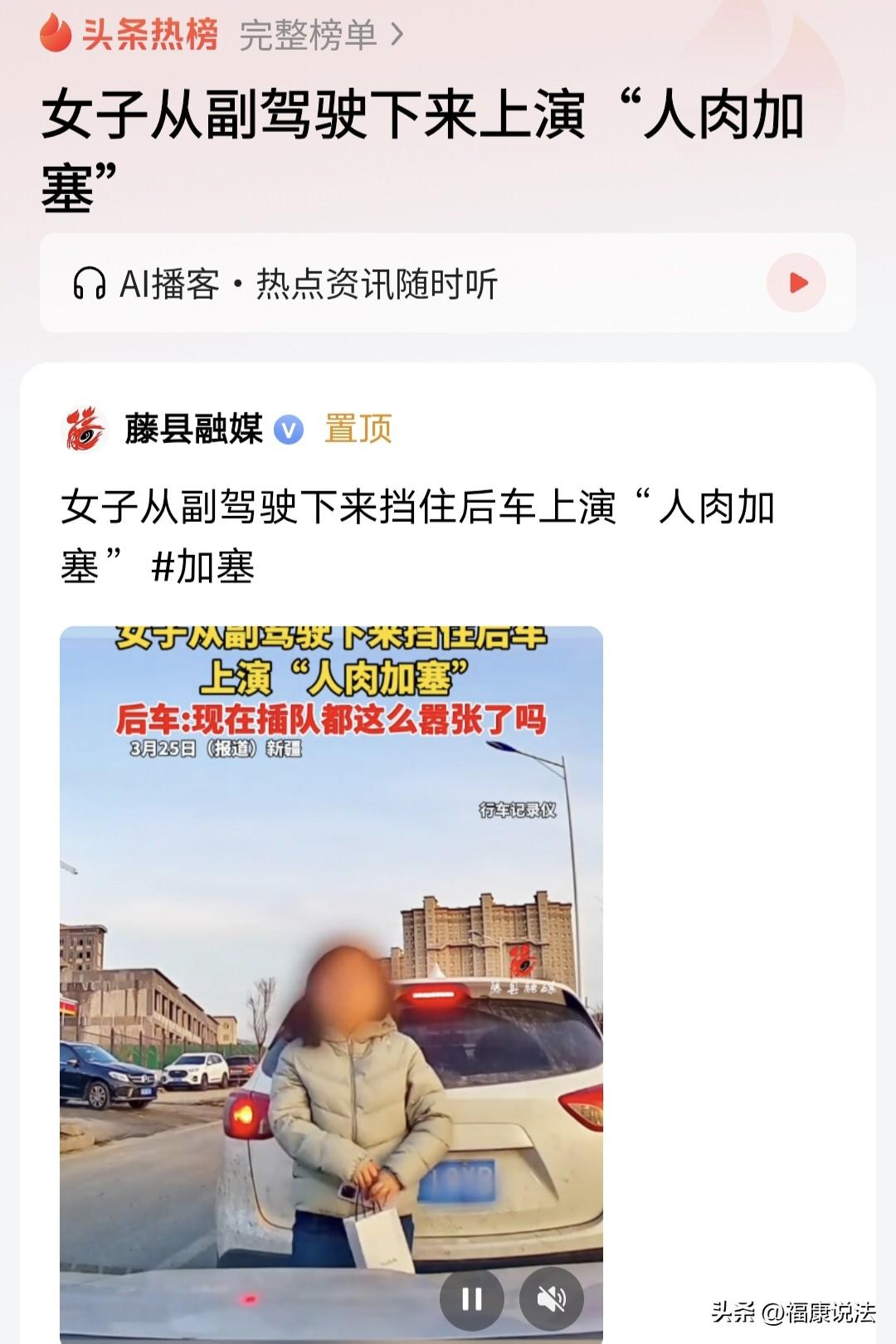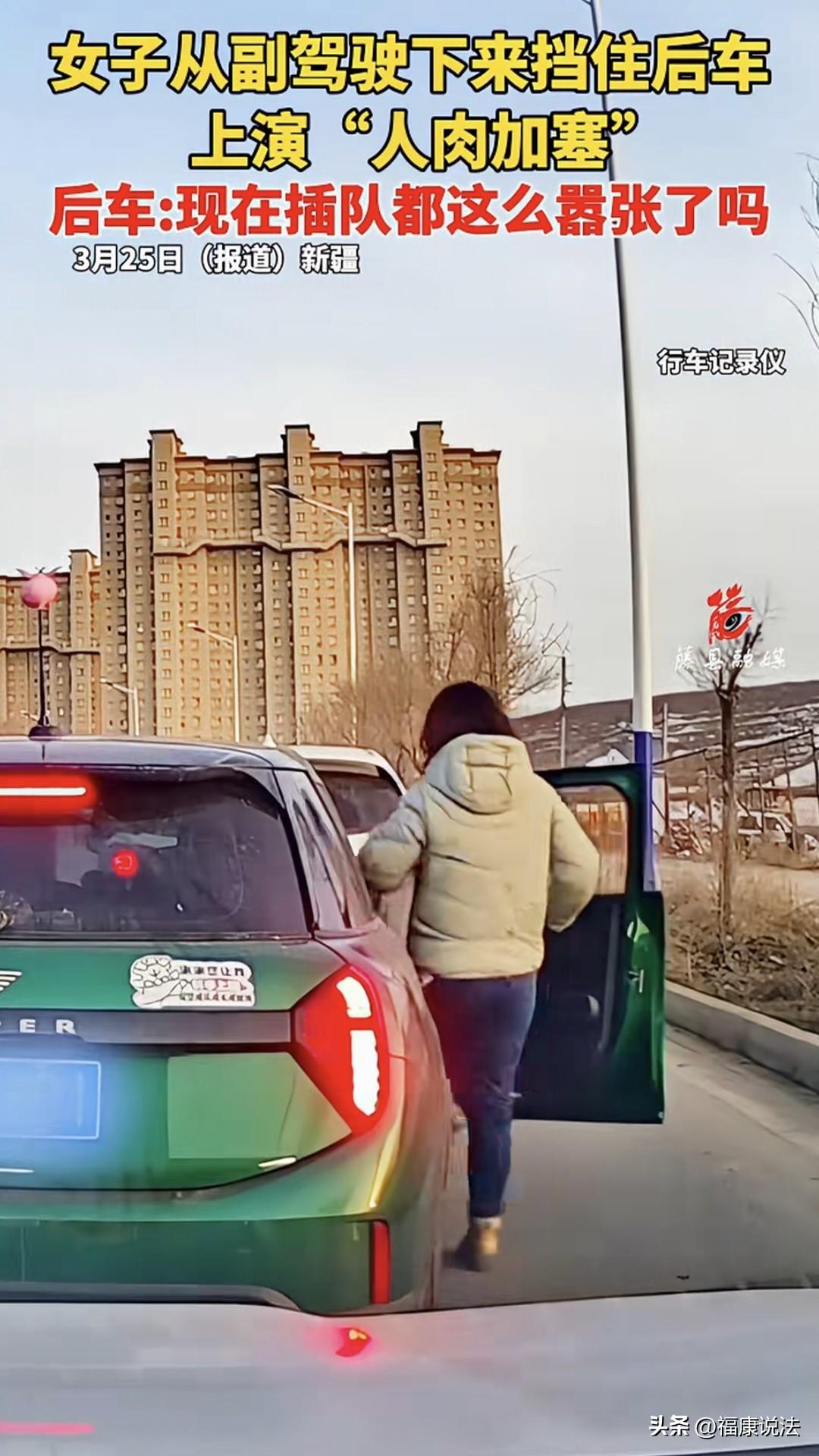 “没见过这么嚣张的!”新疆,女子从副驾驶下来,单手叉腰,挡住后车,让自家车插队进去,然后上车,扬长而去,后车司机:现在插队都这么嚣张了吗?网友:何必呢!你礼貌打个招呼,人家就会让你的。 一加油站附近的马路上,一辆辆车都在排队,这时过来一辆绿色车想加塞,后车司机并没有动,突然,绿车里的人做了一个令人惊掉下巴的操作。 只见绿车想插队却又挤不进去,只好暂时停在后车的边上,一个坐在副驾驶的女子突然打开车门,下了车单手叉腰一手拎着袋子直接挡住后车的路。 更令人气愤的是,女子还面向后车,颇有一种挑衅的意味。 这时,绿车司机开车成功插到车队中。 女子一看插队成功后,一扭头转身快步追上自家车,打开车门坐了进去。 这一套动作如行云流水一般,简直一气呵成,那架势真不是一般人能做到的。 后车司机也被女子这没有素质的行为惊呆了,不禁发出疑问:现在插队都这么嚣张了吗? 后来,女子下车“人肉加塞”插队的视频被发了出来,网友们也是看法不一。 有态度淡定的人表示,大可不必这样,下车做个鞠躬,或者手伸出来,竖起大拇指,懂礼貌的都会让。 跟别人说一下,师傅麻烦让一下,我先过行吗?打个转向灯,为什么用这一出来占位呢?怎 么低级怎么来呀!基本礼貌都不会用吗? 也有人认为后车司机经验不足,后视镜看到有车逆行上来,直接贴上去,距离近的让人都进不去。 他想开门的时候你就直接往前贴上去,不让他开门,逆行还开门,碰着你,他全责。 还有人拿自己的遭遇举例:我就这么愣开过,那个女的一直跟我吵架,我就说不听、不听,那啥念经,最后赔我1200,扣她3分。 那么,女子下车插队的行为,从法律方面怎么看呢? 《道路交通安全法》第45条:机动车遇有前方车辆停车排队等候或者缓慢行驶时,不得借道超车或者占用对面车道,不得穿插等候的车辆 。 通俗讲,排队就是排队,谁也不能想插就插。哪怕挤不进去,也不能下车拦路,这不仅违规,还涉嫌非法拦截车辆,可由交管部门处罚 。 马路是大家的公共资源,人人都有依次通行的权利。加塞本身就是破坏秩序的行为,而下车拦路,更是不遵守规则。 可能有人觉得后车没动,拦一下也没造成事故,算啥大事? 但交通秩序最怕的就是“破窗效应” 如果有人下车拦路成功,之后,可能有人直接下车吵架,说不定就因堵路维权了呢。 一次不被制止的“耍横加塞”,就是给后来人立了坏榜样,最后整个路段的通行效率都会变慢。 其实,处理事情得讲究方法,开车赶时间,想插队能理解,但挤不进去就该等下一轮,或者和后车好好的沟通一下,一般情况都会让的。 用拦路的方式强行插队,看似省了时间,实则风险极大。 万一后车司机情绪上头发生剐蹭,或者自己开门时被后方来车撞到,那点节省的时间,全得用来处理事故、修车、扯皮,得不偿失。 最后想说,文明是底线。出门在外,谁都想图个顺顺当当,在路上要讲规则、守秩序,既是保护自己,也是尊重别人,不是吗?